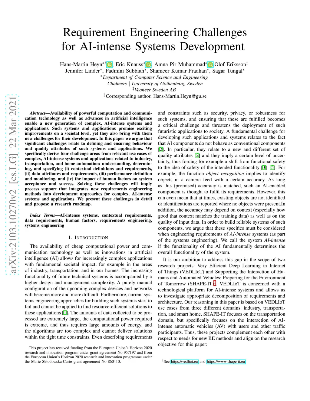 Availability of powerful computation and communication technology as well as advances in artificial intelligence enable a new generation of complex, AI-intense systems and applications. Such systems and applications promise exciting improvements on a societal level, yet they also bring with them new challenges for their development. In this paper we argue that significant challenges relate to defining and ensuring behaviour and quality attributes of such systems and applications. We specifically derive four challenge areas from relevant use cases of complex, AI-intense systems and applications related to industry, transportation, and home automation: understanding, determining, and specifying (i) contextual definitions and requirements, (ii) data attributes and requirements, (iii) performance definition and monitoring, and (iv) the impact of human factors on system acceptance and success. Solving these challenges will imply process support that integrates new requirements engineering methods into development approaches for complex, AI-intense systems and applications. We present these challenges in detail and propose a research roadmap.