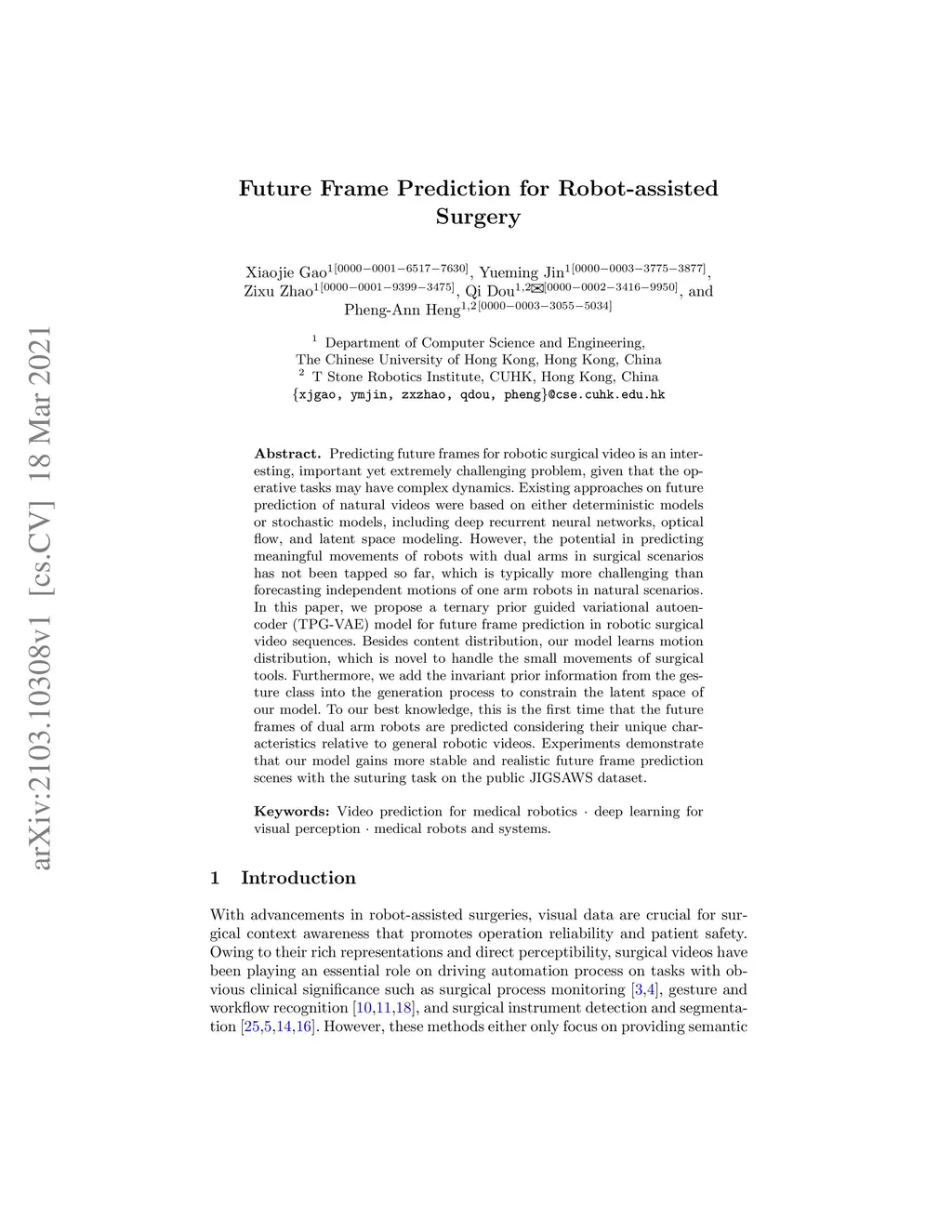 Predicting future frames for robotic surgical video is an interesting, important yet extremely challenging problem, given that the operative tasks may have complex dynamics. Existing approaches on future prediction of natural videos were based on either deterministic models or stochastic models, including deep recurrent neural networks, optical flow, and latent space modeling. However, the potential in predicting meaningful movements of robots with dual arms in surgical scenarios has not been tapped so far, which is typically more challenging than forecasting independent motions of one arm robots in natural scenarios. In this paper, we propose a ternary prior guided variational autoencoder (TPG-VAE) model for future frame prediction in robotic surgical video sequences. Besides content distribution, our model learns motion distribution, which is novel to handle the small movements of surgical tools. Furthermore, we add the invariant prior information from the gesture class into the generation process to constrain the latent space of our model. To our best knowledge, this is the first time that the future frames of dual arm robots are predicted considering their unique characteristics relative to general robotic videos. Experiments demonstrate that our model gains more stable and realistic future frame prediction scenes with the suturing task on the public JIGSAWS dataset.