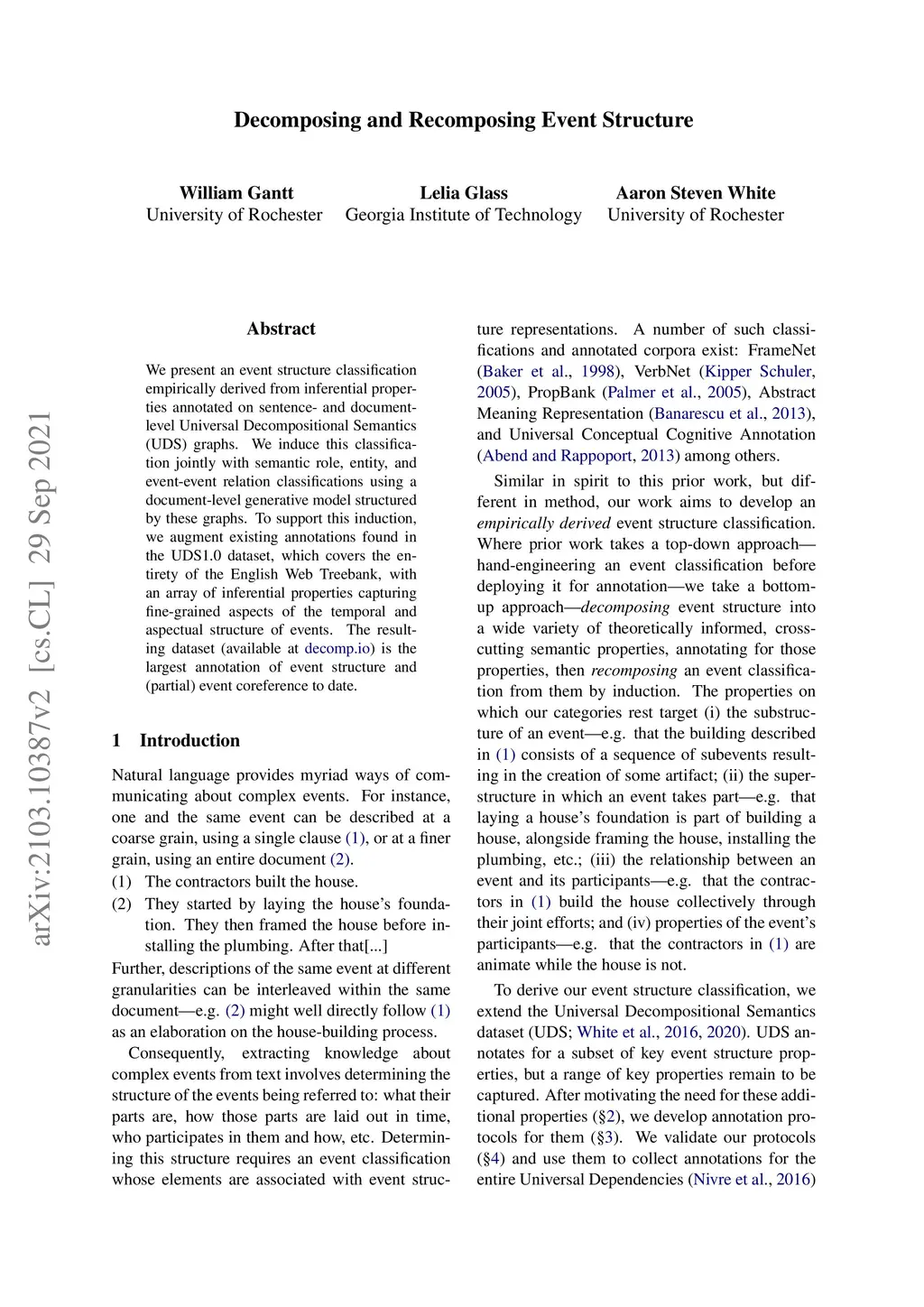 We present an event structure classification empirically derived from inferential properties annotated on sentence- and document-level Universal Decompositional Semantics (UDS) graphs. We induce this classification jointly with semantic role, entity, and event-event relation classifications using a document-level generative model structured by these graphs. To support this induction, we augment existing annotations found in the UDS1.0 dataset, which covers the entirety of the English Web Treebank, with an array of inferential properties capturing fine-grained aspects of the temporal and aspectual structure of events. The resulting dataset (available at decomp.io) is the largest annotation of event structure and (partial) event coreference to date.