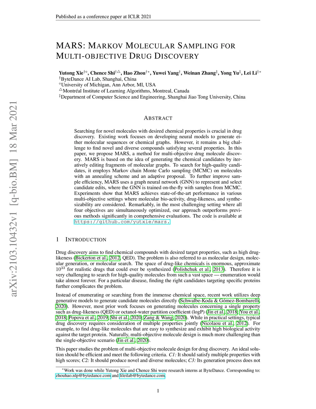 Searching for novel molecules with desired chemical properties is crucial in drug discovery. Existing work focuses on developing neural models to generate either molecular sequences or chemical graphs. However, it remains a big challenge to find novel and diverse compounds satisfying several properties. In this paper, we propose MARS, a method for multi-objective drug molecule discovery. MARS is based on the idea of generating the chemical candidates by iteratively editing fragments of molecular graphs. To search for high-quality candidates, it employs Markov chain Monte Carlo sampling (MCMC) on molecules with an annealing scheme and an adaptive proposal. To further improve sample efficiency, MARS uses a graph neural network (GNN) to represent and select candidate edits, where the GNN is trained on-the-fly with samples from MCMC. Experiments show that MARS achieves state-of-the-art performance in various multi-objective settings where molecular bio-activity, drug-likeness, and synthesizability are considered. Remarkably, in the most challenging setting where all four objectives are simultaneously optimized, our approach outperforms previous methods significantly in comprehensive evaluations. The code is available at https://github.com/yutxie/mars.