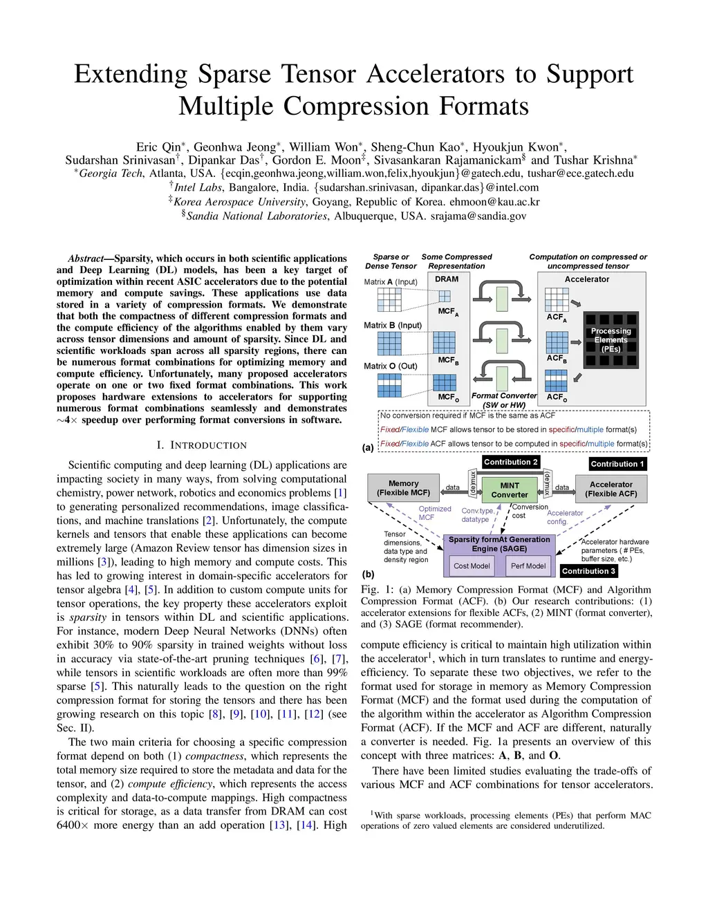 Sparsity, which occurs in both scientific applications and Deep Learning (DL) models, has been a key target of optimization within recent ASIC accelerators due to the potential memory and compute savings. These applications use data stored in a variety of compression formats. We demonstrate that both the compactness of different compression formats and the compute efficiency of the algorithms enabled by them vary across tensor dimensions and amount of sparsity. Since DL and scientific workloads span across all sparsity regions, there can be numerous format combinations for optimizing memory and compute efficiency. Unfortunately, many proposed accelerators operate on one or two fixed format combinations. This work proposes hardware extensions to accelerators for supporting numerous format combinations seamlessly and demonstrates ~4X speedup over performing format conversions in software.