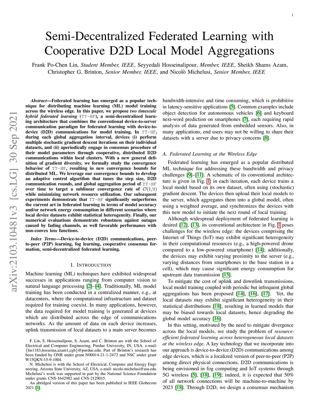 Federated learning has emerged as a popular technique for distributing machine learning (ML) model training across the wireless edge. In this paper, we propose two timescale hybrid federated learning (TT-HF), a semi-decentralized learning architecture that combines the conventional device-to-server communication paradigm for federated learning with device-to-device (D2D) communications for model training. In TT-HF, during each global aggregation interval, devices (i) perform multiple stochastic gradient descent iterations on their individual datasets, and (ii) aperiodically engage in consensus procedure of their model parameters through cooperative, distributed D2D communications within local clusters. With a new general definition of gradient diversity, we formally study the convergence behavior of TT-HF, resulting in new convergence bounds for distributed ML. We leverage our convergence bounds to develop an adaptive control algorithm that tunes the step size, D2D communication rounds, and global aggregation period of TT-HF over time to target a sublinear convergence rate of O(1/t) while minimizing network resource utilization. Our subsequent experiments demonstrate that TT-HF significantly outperforms the current art in federated learning in terms of model accuracy and/or network energy consumption in different scenarios where local device datasets exhibit statistical heterogeneity. Finally, our numerical evaluations demonstrate robustness against outages caused by fading channels, as well favorable performance with non-convex loss functions.