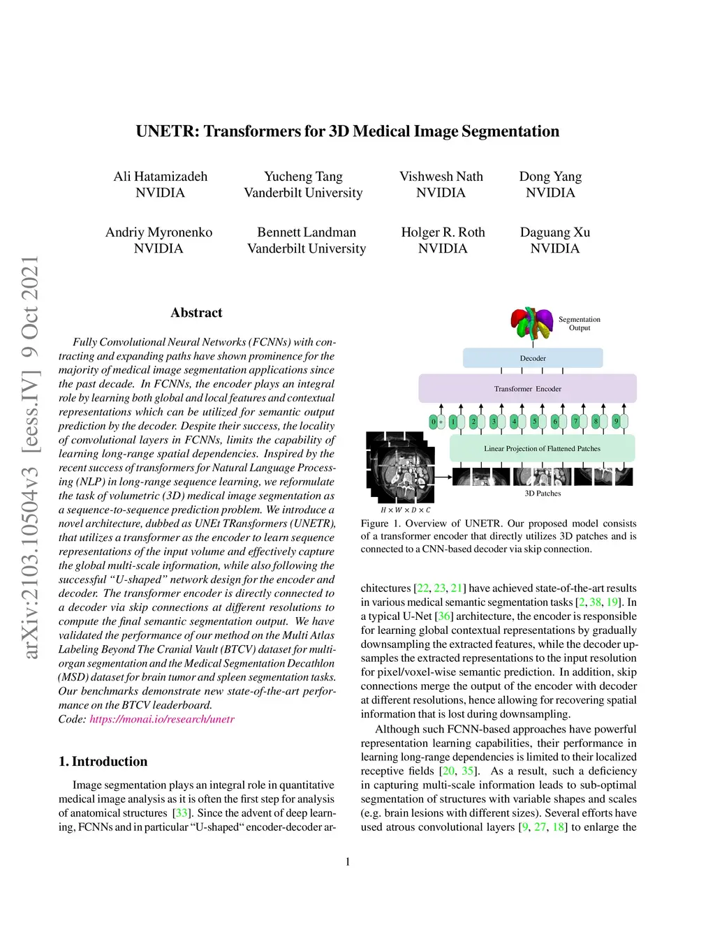 UNETR: Transformers for 3D Medical Image Segmentation