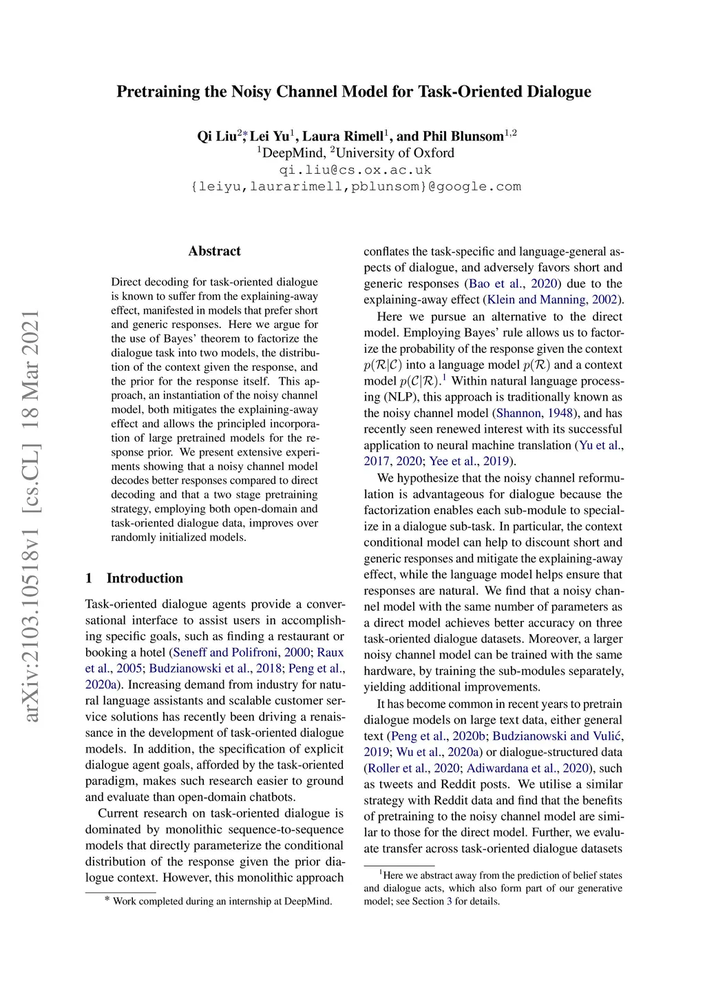 Direct decoding for task-oriented dialogue is known to suffer from the explaining-away effect, manifested in models that prefer short and generic responses. Here we argue for the use of Bayes' theorem to factorize the dialogue task into two models, the distribution of the context given the response, and the prior for the response itself. This approach, an instantiation of the noisy channel model, both mitigates the explaining-away effect and allows the principled incorporation of large pretrained models for the response prior. We present extensive experiments showing that a noisy channel model decodes better responses compared to direct decoding and that a two stage pretraining strategy, employing both open-domain and task-oriented dialogue data, improves over randomly initialized models.