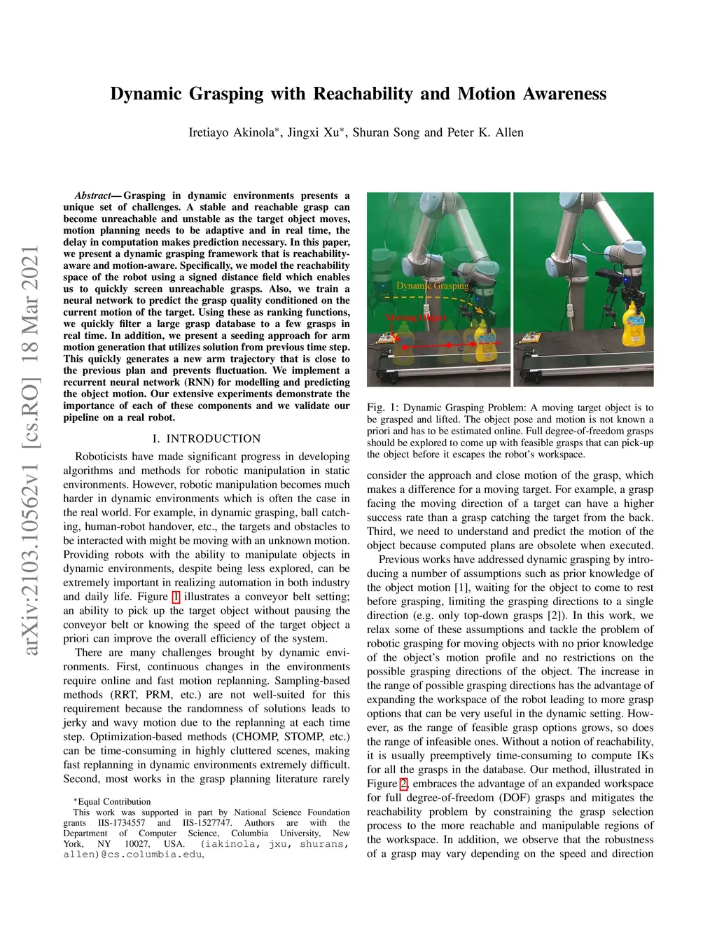 Grasping in dynamic environments presents a unique set of challenges. A stable and reachable grasp can become unreachable and unstable as the target object moves, motion planning needs to be adaptive and in real time, the delay in computation makes prediction necessary. In this paper, we present a dynamic grasping framework that is reachability-aware and motion-aware. Specifically, we model the reachability space of the robot using a signed distance field which enables us to quickly screen unreachable grasps. Also, we train a neural network to predict the grasp quality conditioned on the current motion of the target. Using these as ranking functions, we quickly filter a large grasp database to a few grasps in real time. In addition, we present a seeding approach for arm motion generation that utilizes solution from previous time step. This quickly generates a new arm trajectory that is close to the previous plan and prevents fluctuation. We implement a recurrent neural network (RNN) for modelling and predicting the object motion. Our extensive experiments demonstrate the importance of each of these components and we validate our pipeline on a real robot.