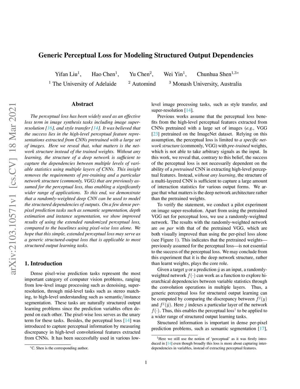 The perceptual loss has been widely used as an effective loss term in image synthesis tasks including image super-resolution, and style transfer. It was believed that the success lies in the high-level perceptual feature representations extracted from CNNs pretrained with a large set of images. Here we reveal that, what matters is the network structure instead of the trained weights. Without any learning, the structure of a deep network is sufficient to capture the dependencies between multiple levels of variable statistics using multiple layers of CNNs. This insight removes the requirements of pre-training and a particular network structure (commonly, VGG) that are previously assumed for the perceptual loss, thus enabling a significantly wider range of applications. To this end, we demonstrate that a randomly-weighted deep CNN can be used to model the structured dependencies of outputs. On a few dense per-pixel prediction tasks such as semantic segmentation, depth estimation and instance segmentation, we show improved results of using the extended randomized perceptual loss, compared to the baselines using pixel-wise loss alone. We hope that this simple, extended perceptual loss may serve as a generic structured-output loss that is applicable to most structured output learning tasks.