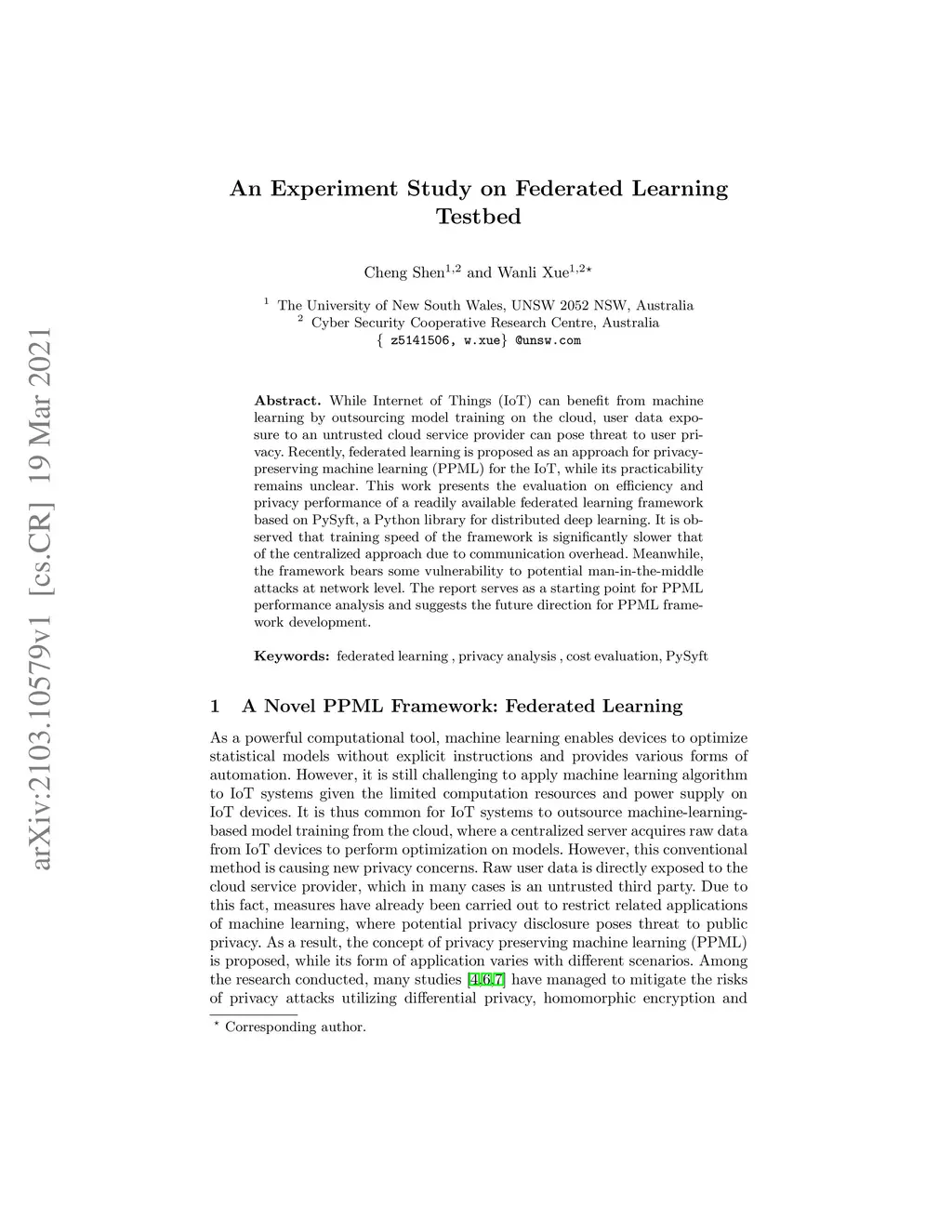 While the Internet of Things (IoT) can benefit from machine learning by outsourcing model training on the cloud, user data exposure to an untrusted cloud service provider can pose threat to user privacy. Recently, federated learning is proposed as an approach for privacy-preserving machine learning (PPML) for the IoT, while its practicability remains unclear. This work presents the evaluation on the efficiency and privacy performance of a readily available federated learning framework based on PySyft, a Python library for distributed deep learning. It is observed that the training speed of the framework is significantly slower than of the centralized approach due to communication overhead. Meanwhile, the framework bears some vulnerability to potential man-in-the-middle attacks at the network level. The report serves as a starting point for PPML performance analysis and suggests the future direction for PPML framework development.