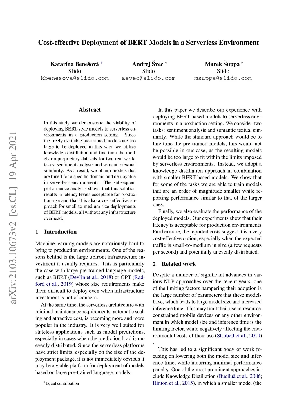 In this study we demonstrate the viability of deploying BERT-style models to serverless environments in a production setting. Since the freely available pre-trained models are too large to be deployed in this way, we utilize knowledge distillation and fine-tune the models on proprietary datasets for two real-world tasks: sentiment analysis and semantic textual similarity. As a result, we obtain models that are tuned for a specific domain and deployable in serverless environments. The subsequent performance analysis shows that this solution results in latency levels acceptable for production use and that it is also a cost-effective approach for small-to-medium size deployments of BERT models, all without any infrastructure overhead.