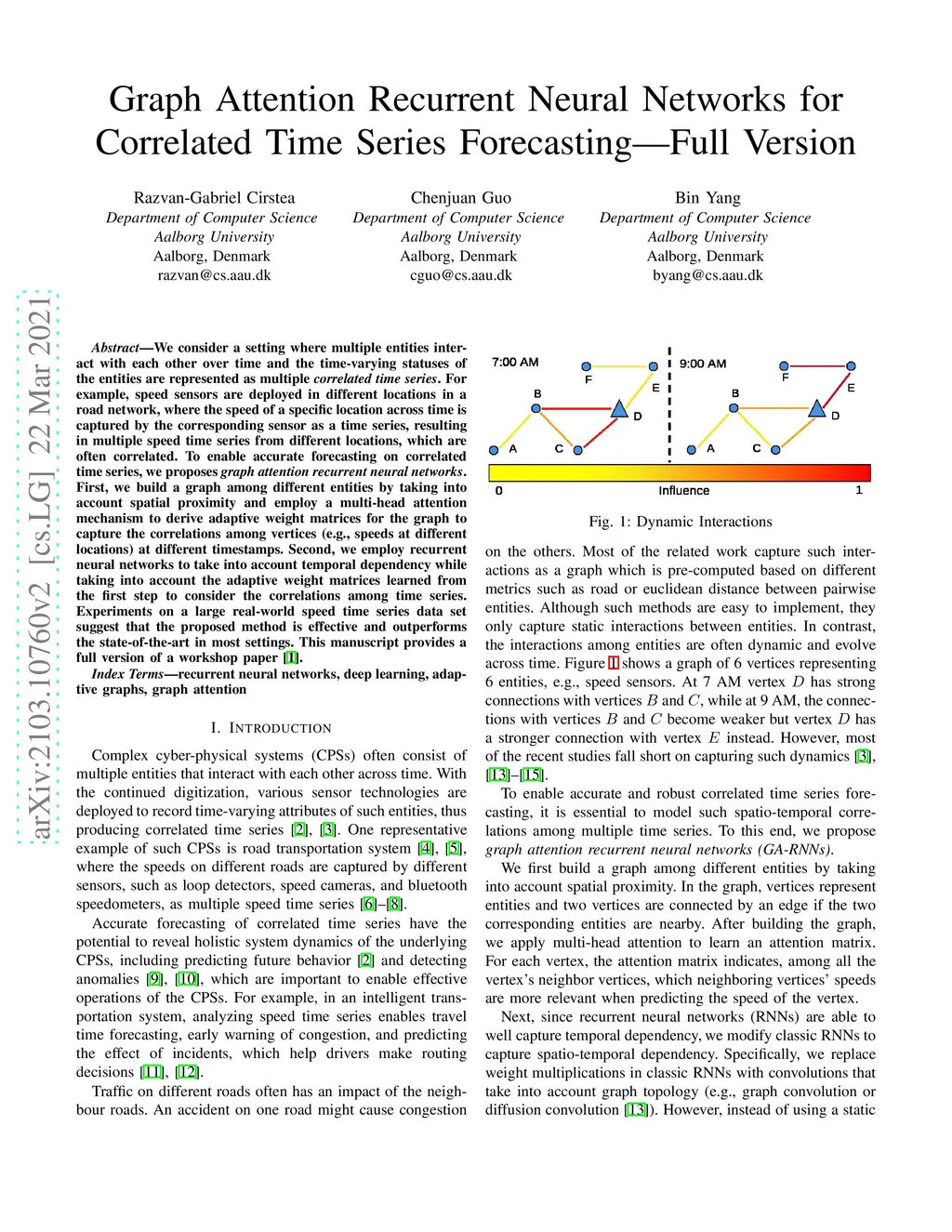 We consider a setting where multiple entities inter-act with each other over time and the time-varying statuses of the entities are represented as multiple correlated time series. For example, speed sensors are deployed in different locations in a road network, where the speed of a specific location across time is captured by the corresponding sensor as a time series, resulting in multiple speed time series from different locations, which are often correlated. To enable accurate forecasting on correlated time series, we proposes graph attention recurrent neural networks.First, we build a graph among different entities by taking into account spatial proximity and employ a multi-head attention mechanism to derive adaptive weight matrices for the graph to capture the correlations among vertices (e.g., speeds at different locations) at different timestamps. Second, we employ recurrent neural networks to take into account temporal dependency while taking into account the adaptive weight matrices learned from the first step to consider the correlations among time series.Experiments on a large real-world speed time series data set suggest that the proposed method is effective and outperforms the state-of-the-art in most settings. This manuscript provides a full version of a workshop paper [1].