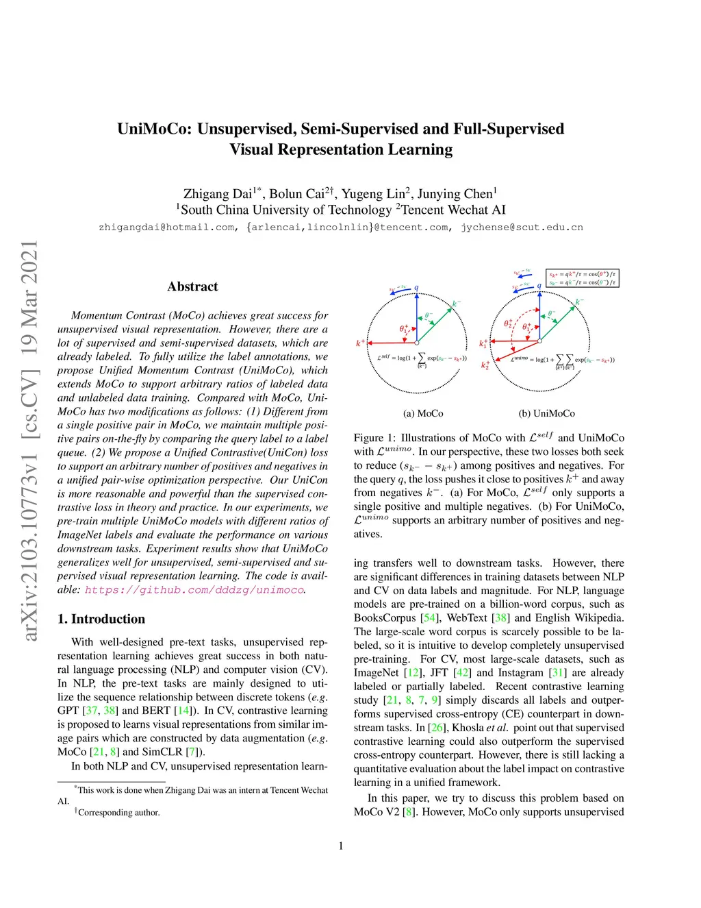 UniMoCo: Unsupervised, Semi-Supervised and Full-Supervised Visual