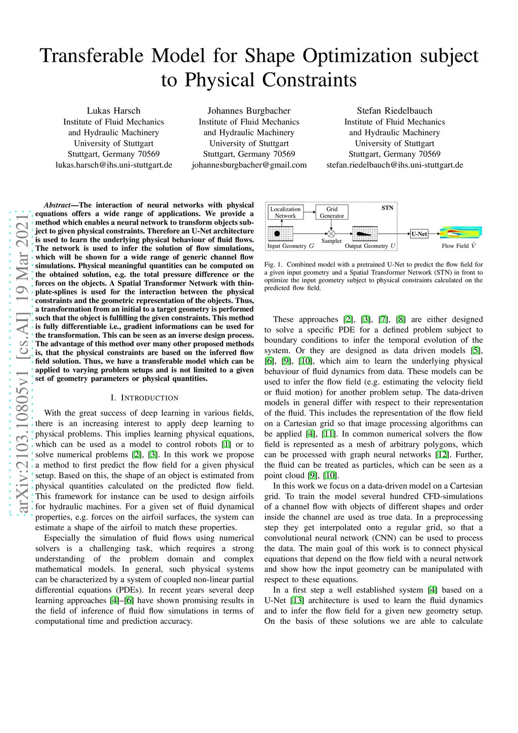 The interaction of neural networks with physical equations offers a wide range of applications. We provide a method which enables a neural network to transform objects subject to given physical constraints. Therefore an U-Net architecture is used to learn the underlying physical behaviour of fluid flows. The network is used to infer the solution of flow simulations, which will be shown for a wide range of generic channel flow simulations. Physical meaningful quantities can be computed on the obtained solution, e.g. the total pressure difference or the forces on the objects. A Spatial Transformer Network with thin-plate-splines is used for the interaction between the physical constraints and the geometric representation of the objects. Thus, a transformation from an initial to a target geometry is performed such that the object is fulfilling the given constraints. This method is fully differentiable i.e., gradient informations can be used for the transformation. This can be seen as an inverse design process. The advantage of this method over many other proposed methods is, that the physical constraints are based on the inferred flow field solution. Thus, we have a transferable model which can be applied to varying problem setups and is not limited to a given set of geometry parameters or physical quantities.