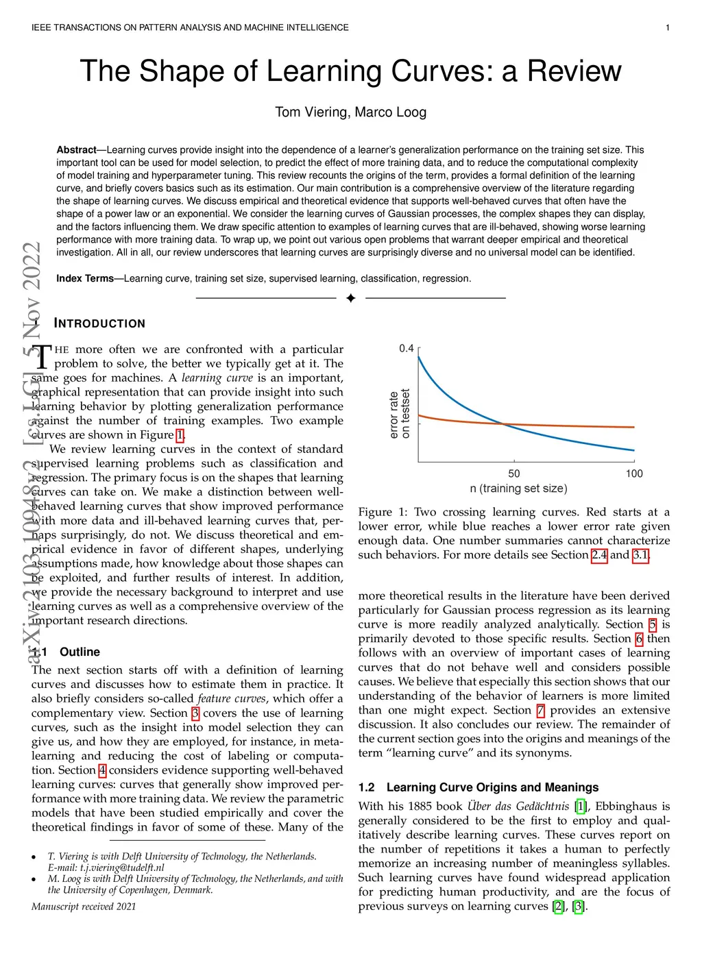 Learning curves provide insight into the dependence of a learner's generalization performance on the training set size. This important tool can be used for model selection, to predict the effect of more training data, and to reduce the computational complexity of model training and hyperparameter tuning. This review recounts the origins of the term, provides a formal definition of the learning curve, and briefly covers basics such as its estimation. Our main contribution is a comprehensive overview of the literature regarding the shape of learning curves. We discuss empirical and theoretical evidence that supports well-behaved curves that often have the shape of a power law or an exponential. We consider the learning curves of Gaussian processes, the complex shapes they can display, and the factors influencing them. We draw specific attention to examples of learning curves that are ill-behaved, showing worse learning performance with more training data. To wrap up, we point out various open problems that warrant deeper empirical and theoretical investigation. All in all, our review underscores that learning curves are surprisingly diverse and no universal model can be identified.