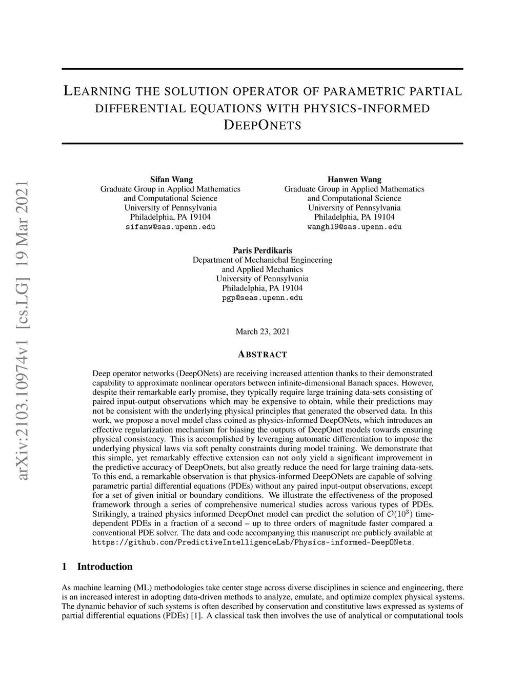 Deep operator networks (DeepONets) are receiving increased attention thanks to their demonstrated capability to approximate nonlinear operators between infinite-dimensional Banach spaces. However, despite their remarkable early promise, they typically require large training data-sets consisting of paired input-output observations which may be expensive to obtain, while their predictions may not be consistent with the underlying physical principles that generated the observed data. In this work, we propose a novel model class coined as physics-informed DeepONets, which introduces an effective regularization mechanism for biasing the outputs of DeepOnet models towards ensuring physical consistency. This is accomplished by leveraging automatic differentiation to impose the underlying physical laws via soft penalty constraints during model training. We demonstrate that this simple, yet remarkably effective extension can not only yield a significant improvement in the predictive accuracy of DeepOnets, but also greatly reduce the need for large training data-sets. To this end, a remarkable observation is that physics-informed DeepONets are capable of solving parametric partial differential equations (PDEs) without any paired input-output observations, except for a set of given initial or boundary conditions. We illustrate the effectiveness of the proposed framework through a series of comprehensive numerical studies across various types of PDEs. Strikingly, a trained physics informed DeepOnet model can predict the solution of time-dependent PDEs in a fraction of a second -- up to three orders of magnitude faster compared a conventional PDE solver. The data and code accompanying this manuscript are publicly available at \url{https://github.com/PredictiveIntelligenceLab/Physics-informed-DeepONets}.