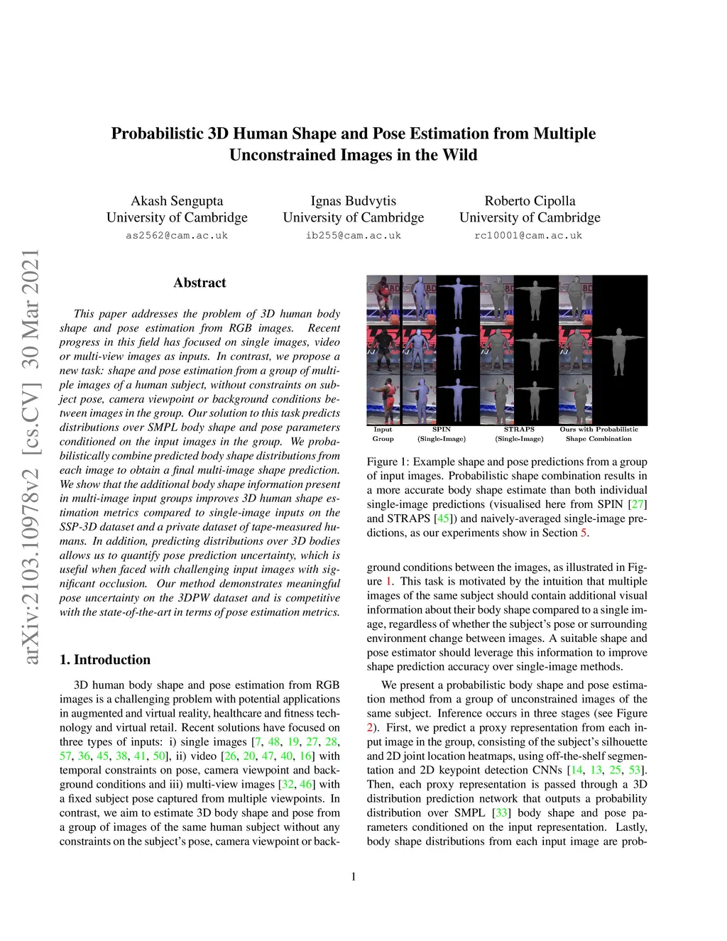 This paper addresses the problem of 3D human body shape and pose estimation from RGB images. Recent progress in this field has focused on single images, video or multi-view images as inputs. In contrast, we propose a new task: shape and pose estimation from a group of multiple images of a human subject, without constraints on subject pose, camera viewpoint or background conditions between images in the group. Our solution to this task predicts distributions over SMPL body shape and pose parameters conditioned on the input images in the group. We probabilistically combine predicted body shape distributions from each image to obtain a final multi-image shape prediction. We show that the additional body shape information present in multi-image input groups improves 3D human shape estimation metrics compared to single-image inputs on the SSP-3D dataset and a private dataset of tape-measured humans. In addition, predicting distributions over 3D bodies allows us to quantify pose prediction uncertainty, which is useful when faced with challenging input images with significant occlusion. Our method demonstrates meaningful pose uncertainty on the 3DPW dataset and is competitive with the state-of-the-art in terms of pose estimation metrics.