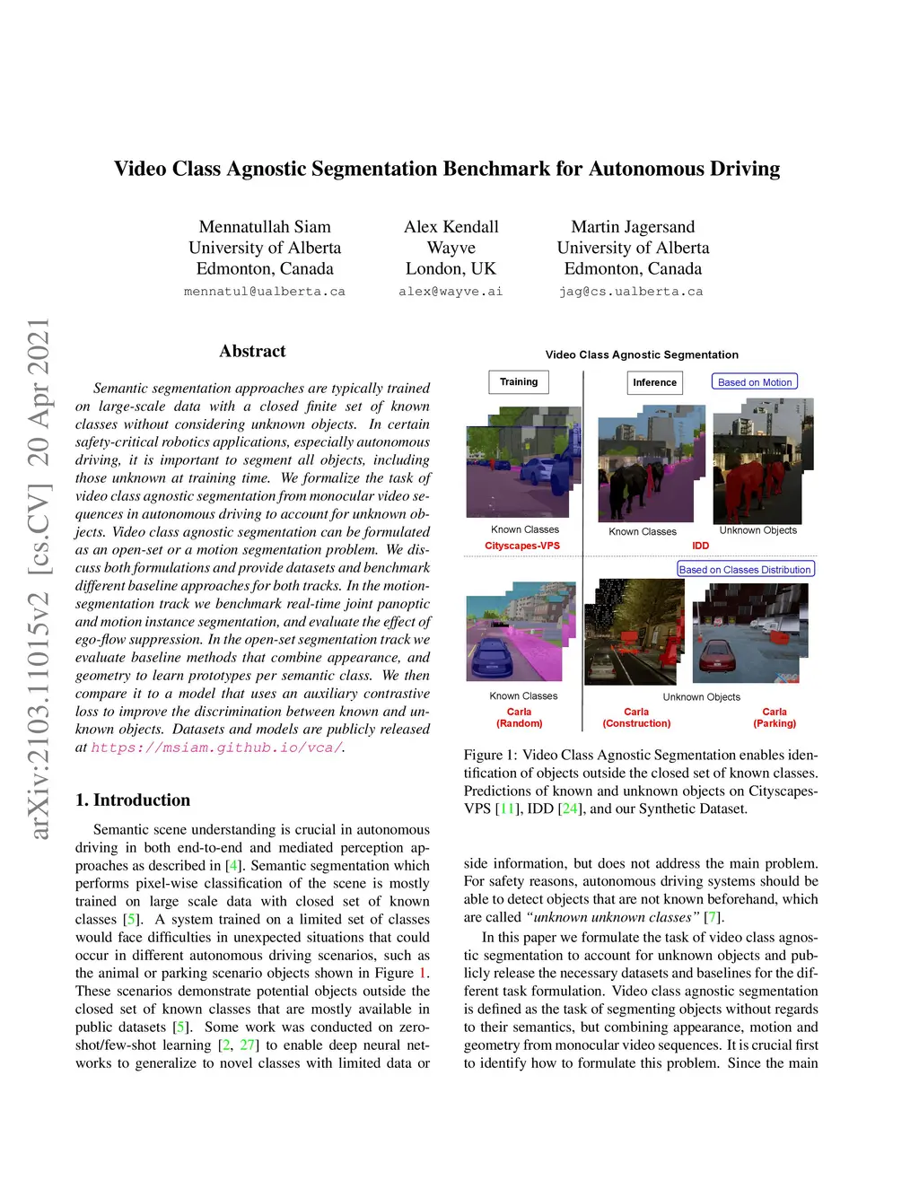 Semantic segmentation approaches are typically trained on large-scale data with a closed finite set of known classes without considering unknown objects. In certain safety-critical robotics applications, especially autonomous driving, it is important to segment all objects, including those unknown at training time. We formalize the task of video class agnostic segmentation from monocular video sequences in autonomous driving to account for unknown objects. Video class agnostic segmentation can be formulated as an open-set or a motion segmentation problem. We discuss both formulations and provide datasets and benchmark different baseline approaches for both tracks. In the motion-segmentation track we benchmark real-time joint panoptic and motion instance segmentation, and evaluate the effect of ego-flow suppression. In the open-set segmentation track we evaluate baseline methods that combine appearance, and geometry to learn prototypes per semantic class. We then compare it to a model that uses an auxiliary contrastive loss to improve the discrimination between known and unknown objects. Datasets and models are publicly released at https://msiam.github.io/vca/.