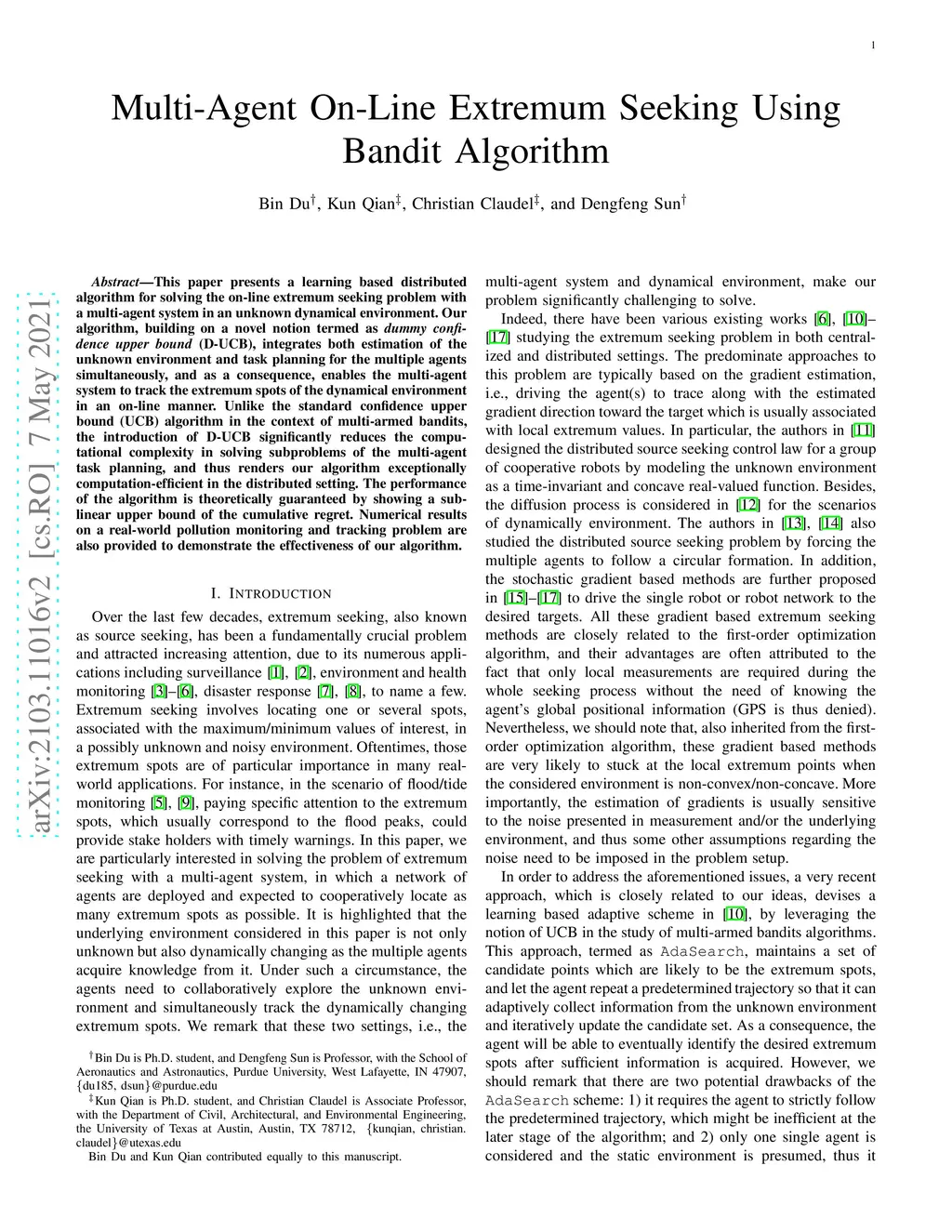 This paper presents an algorithmic framework for the distributed on-line source seeking, termed as 'DoSS', with a multi-robot system in an unknown dynamical environment. Our algorithm, building on a novel concept called dummy confidence upper bound (D-UCB), integrates both estimation of the unknown environment and task planning for the multiple robots simultaneously, and as a result, drives the team of robots to a steady state in which multiple sources of interest are located. Unlike the standard UCB algorithm in the context of multi-armed bandits, the introduction of D-UCB significantly reduces the computational complexity in solving subproblems of the multi-robot task planning. This also enables our 'DoSS' algorithm to be implementable in a distributed on-line manner. The performance of the algorithm is theoretically guaranteed by showing a sub-linear upper bound of the cumulative regret. Numerical results on a real-world methane emission seeking problem are also provided to demonstrate the effectiveness of the proposed algorithm.