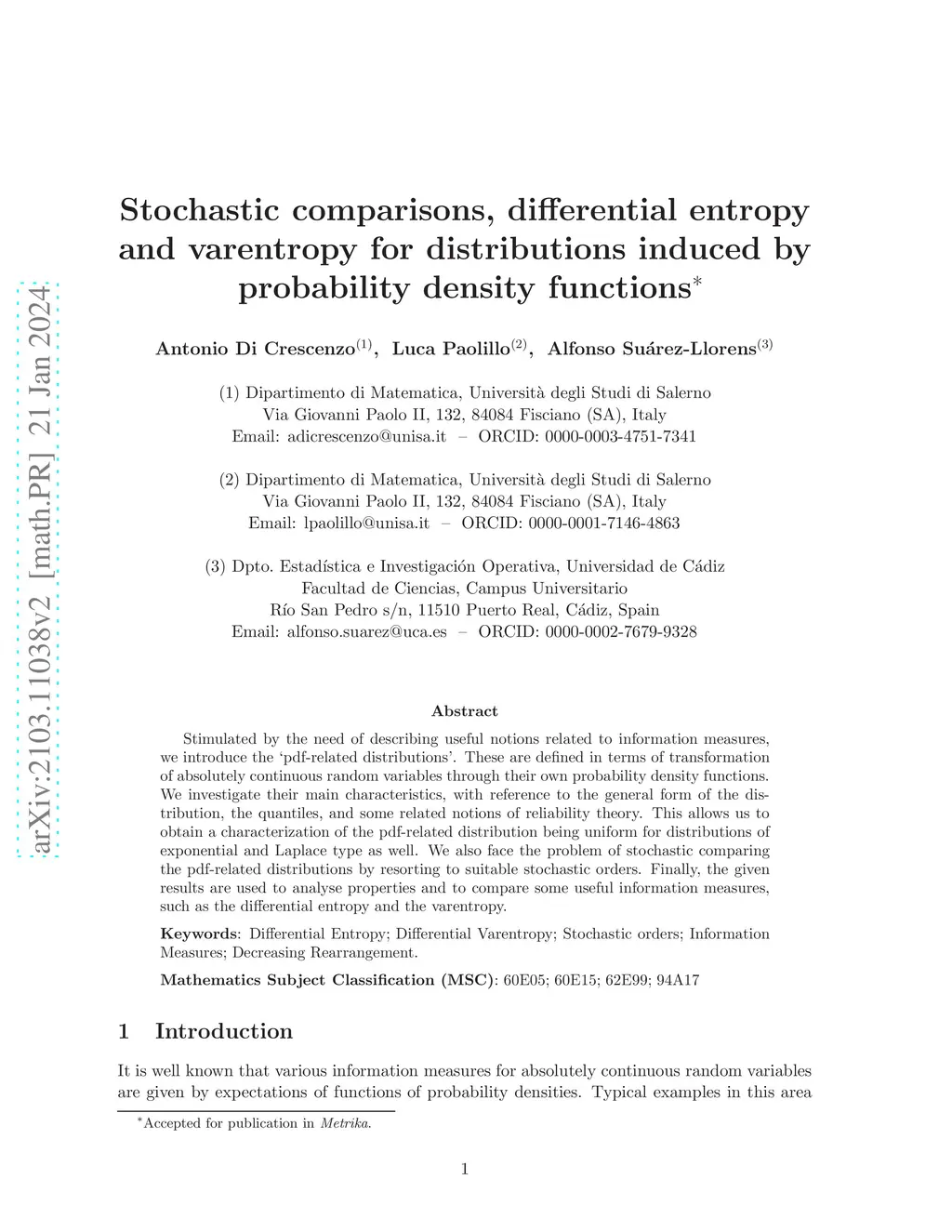 Stimulated by the need of describing useful notions related to information measures, we introduce the `pdf-related distributions'. These are defined in terms of transformation of absolutely continuous random variables through their own probability density functions. We investigate their main characteristics, with reference to the general form of the distribution, the quantiles, and some related notions of reliability theory. This allows us to obtain a characterization of the pdf-related distribution being uniform for distributions of exponential and Laplace type as well. We also face the problem of stochastic comparing the pdf-related distributions by resorting to suitable stochastic orders. Finally, the given results are used to analyse properties and to compare some useful information measures, such as the differential entropy and the varentropy.