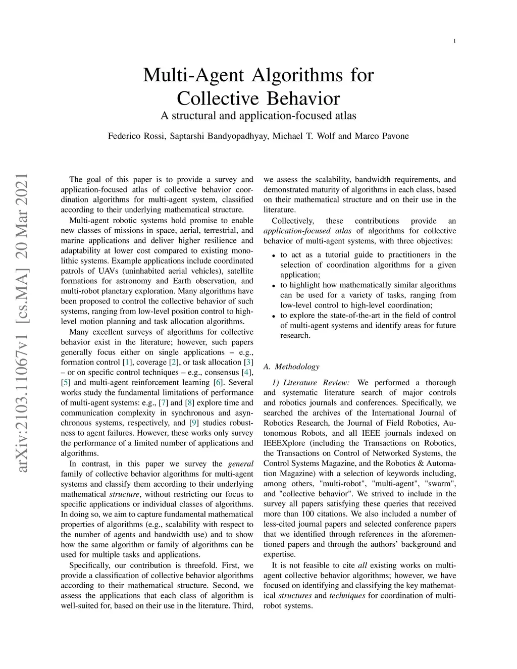 The goal of this paper is to provide a survey and application-focused atlas of collective behavior coordination algorithms for multi-agent systems. We survey the general family of collective behavior algorithms for multi-agent systems and classify them according to their underlying mathematical structure. In doing so, we aim to capture fundamental mathematical properties of algorithms (e.g., scalability with respect to the number of agents and bandwidth use) and to show how the same algorithm or family of algorithms can be used for multiple tasks and applications. Collectively, this paper provides an application-focused atlas of algorithms for collective behavior of multi-agent systems, with three objectives: 1. to act as a tutorial guide to practitioners in the selection of coordination algorithms for a given application; 2. to highlight how mathematically similar algorithms can be used for a variety of tasks, ranging from low-level control to high-level coordination; 3. to explore the state-of-the-art in the field of control of multi-agent systems and identify areas for future research.