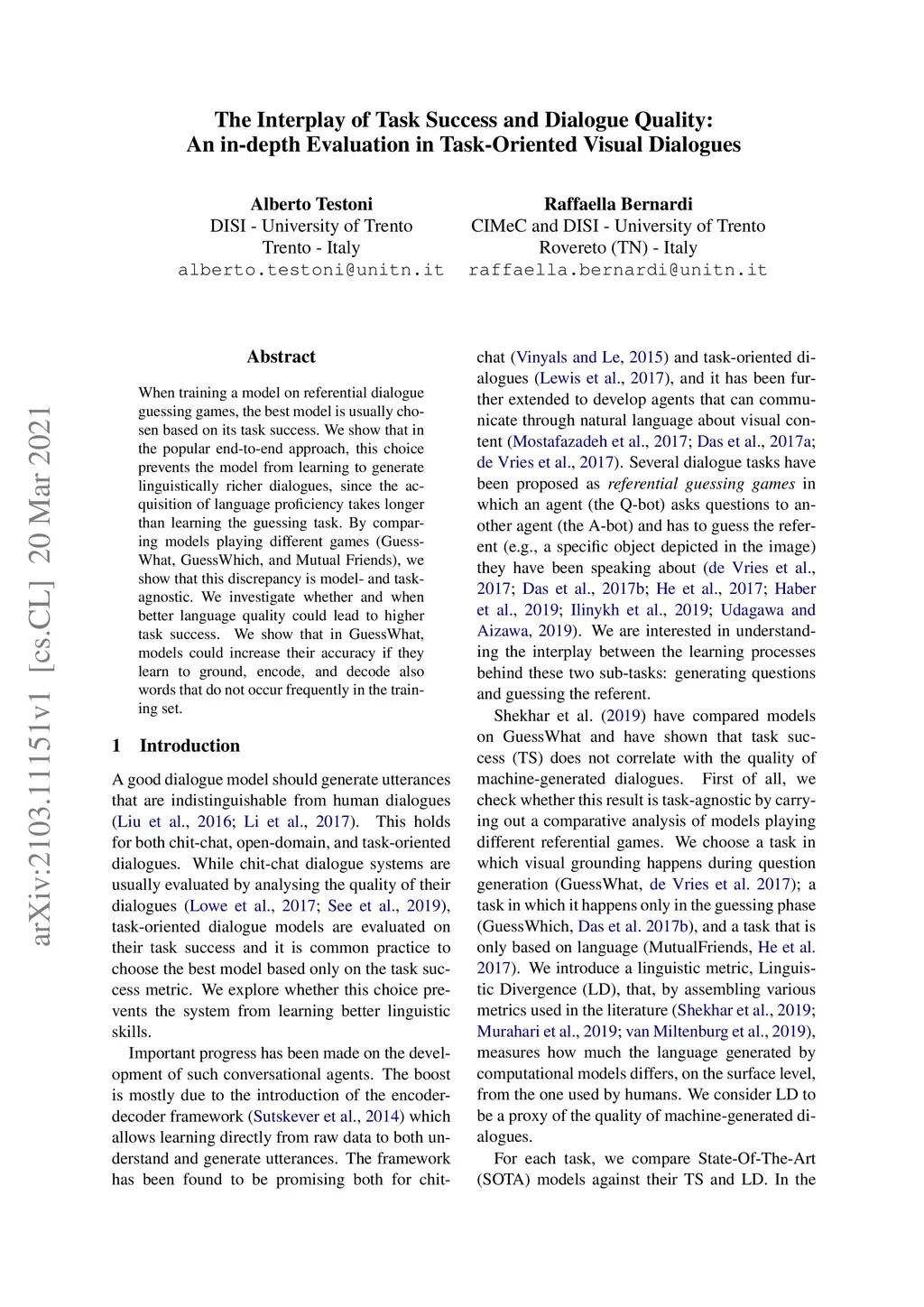 When training a model on referential dialogue guessing games, the best model is usually chosen based on its task success. We show that in the popular end-to-end approach, this choice prevents the model from learning to generate linguistically richer dialogues, since the acquisition of language proficiency takes longer than learning the guessing task. By comparing models playing different games (GuessWhat, GuessWhich, and Mutual Friends), we show that this discrepancy is model- and task-agnostic. We investigate whether and when better language quality could lead to higher task success. We show that in GuessWhat, models could increase their accuracy if they learn to ground, encode, and decode also words that do not occur frequently in the training set.