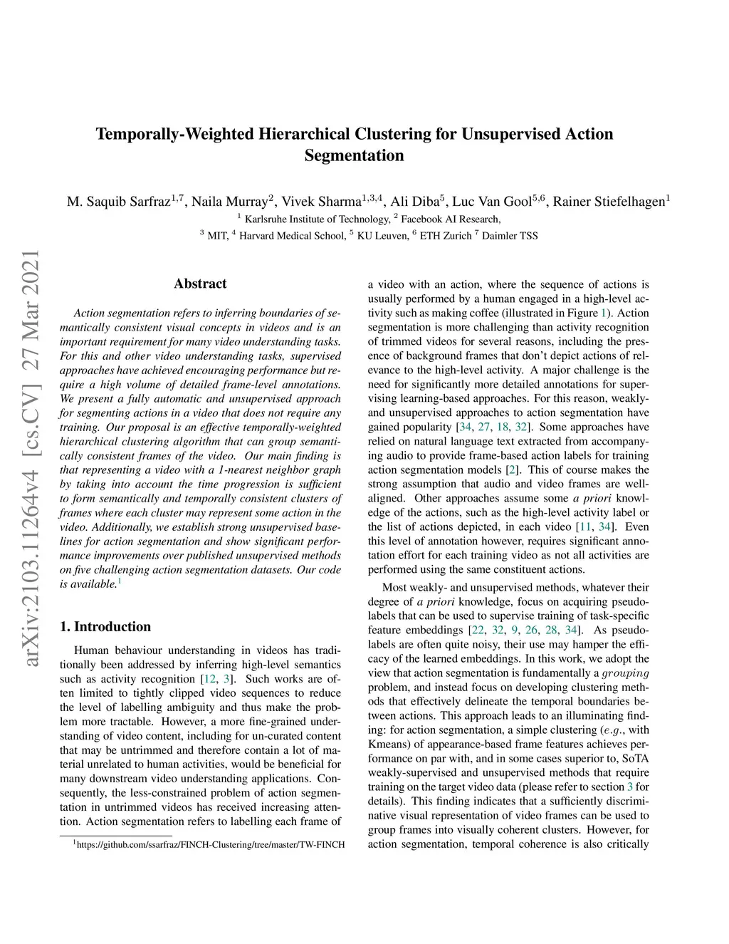 Action segmentation refers to inferring boundaries of semantically consistent visual concepts in videos and is an important requirement for many video understanding tasks. For this and other video understanding tasks, supervised approaches have achieved encouraging performance but require a high volume of detailed frame-level annotations. We present a fully automatic and unsupervised approach for segmenting actions in a video that does not require any training. Our proposal is an effective temporally-weighted hierarchical clustering algorithm that can group semantically consistent frames of the video. Our main finding is that representing a video with a 1-nearest neighbor graph by taking into account the time progression is sufficient to form semantically and temporally consistent clusters of frames where each cluster may represent some action in the video. Additionally, we establish strong unsupervised baselines for action segmentation and show significant performance improvements over published unsupervised methods on five challenging action segmentation datasets. Our code is available at https://github.com/ssarfraz/FINCH-Clustering/tree/master/TW-FINCH
