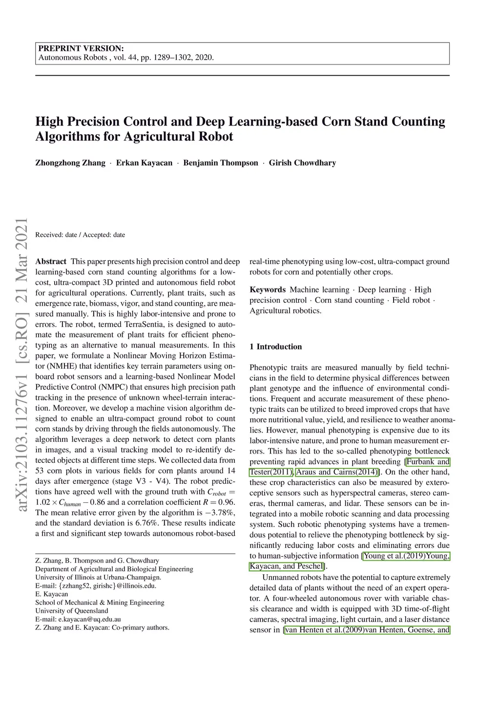 This paper presents high precision control and deep learning-based corn stand counting algorithms for a low-cost, ultra-compact 3D printed and autonomous field robot for agricultural operations. Currently, plant traits, such as emergence rate, biomass, vigor, and stand counting, are measured manually. This is highly labor-intensive and prone to errors. The robot, termed TerraSentia, is designed to automate the measurement of plant traits for efficient phenotyping as an alternative to manual measurements. In this paper, we formulate a Nonlinear Moving Horizon Estimator (NMHE) that identifies key terrain parameters using onboard robot sensors and a learning-based Nonlinear Model Predictive Control (NMPC) that ensures high precision path tracking in the presence of unknown wheel-terrain interaction. Moreover, we develop a machine vision algorithm designed to enable an ultra-compact ground robot to count corn stands by driving through the fields autonomously. The algorithm leverages a deep network to detect corn plants in images, and a visual tracking model to re-identify detected objects at different time steps. We collected data from 53 corn plots in various fields for corn plants around 14 days after emergence (stage V3 - V4). The robot predictions have agreed well with the ground truth with and a correlation coefficient . The mean relative error given by the algorithm is , and the standard deviation is . These results indicate a first and significant step towards autonomous robot-based real-time phenotyping using low-cost, ultra-compact ground robots for corn and potentially other crops.