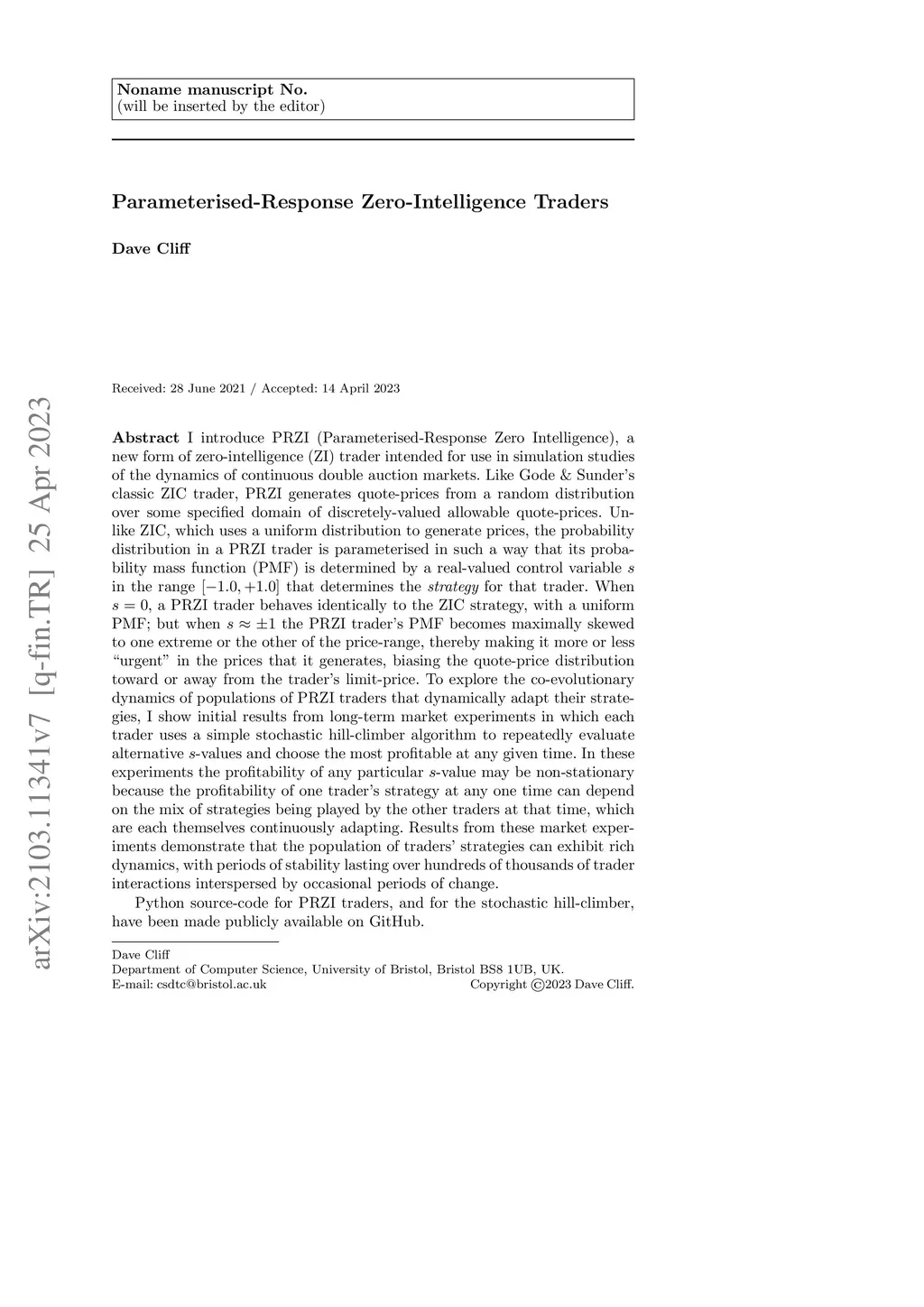 Technical Note: Parameterised-Response Zero-Intelligence (PRZI) Traders