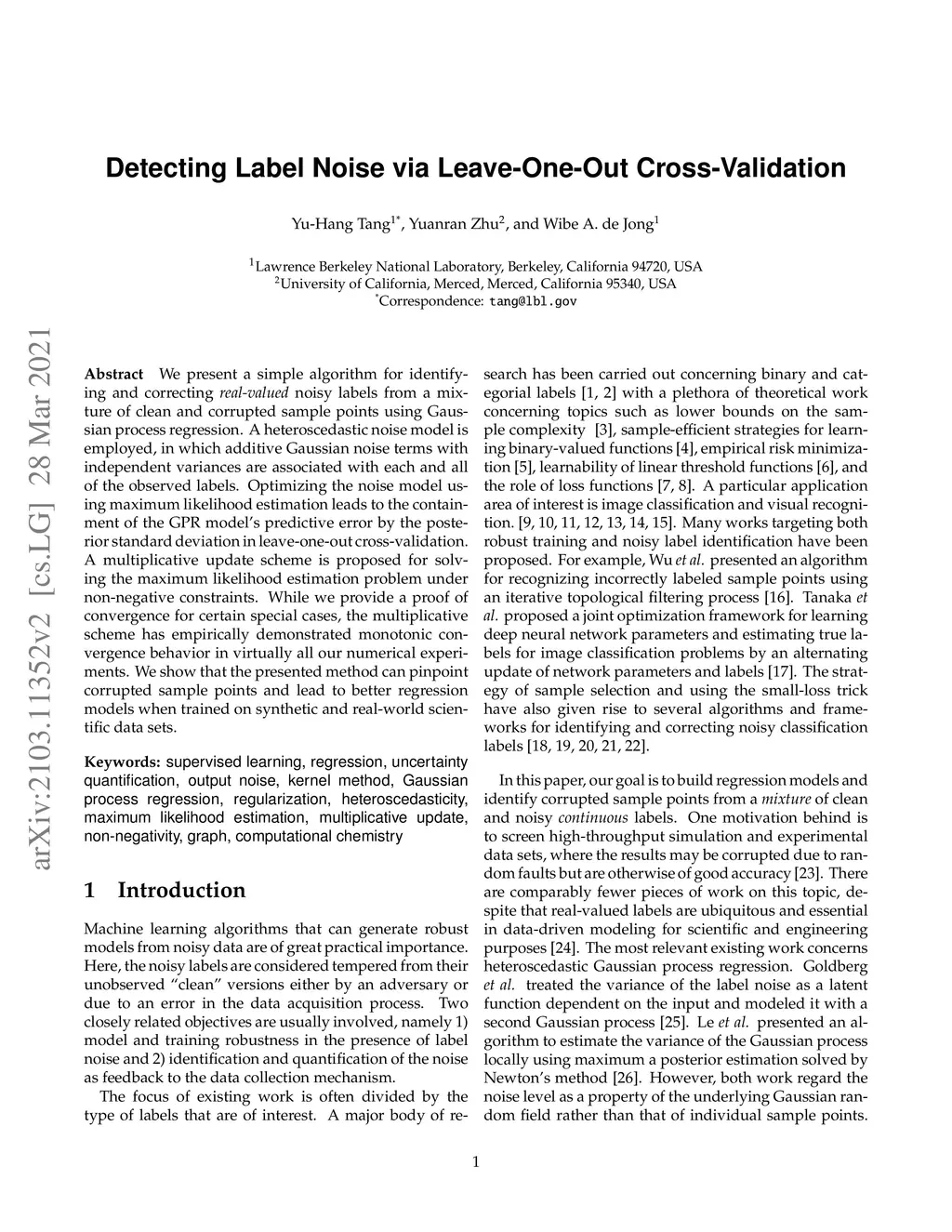 We present a simple algorithm for identifying and correcting real-valued noisy labels from a mixture of clean and corrupted sample points using Gaussian process regression. A heteroscedastic noise model is employed, in which additive Gaussian noise terms with independent variances are associated with each and all of the observed labels. Optimizing the noise model using maximum likelihood estimation leads to the containment of the GPR model's predictive error by the posterior standard deviation in leave-one-out cross-validation. A multiplicative update scheme is proposed for solving the maximum likelihood estimation problem under non-negative constraints. While we provide proof of convergence for certain special cases, the multiplicative scheme has empirically demonstrated monotonic convergence behavior in virtually all our numerical experiments. We show that the presented method can pinpoint corrupted sample points and lead to better regression models when trained on synthetic and real-world scientific data sets.