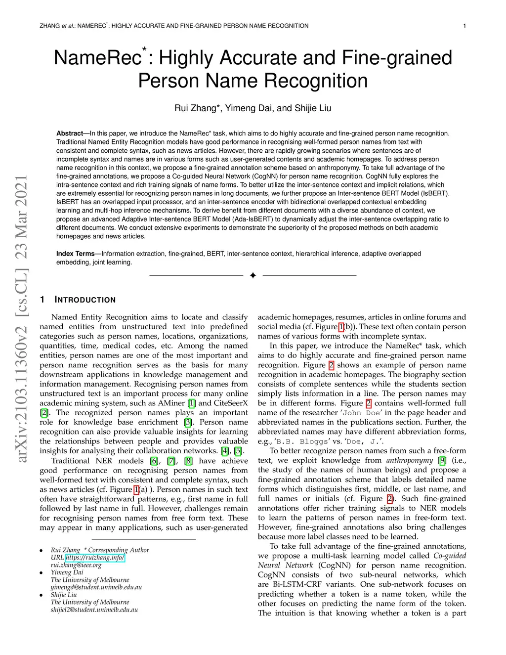 In this paper, we introduce the NameRec* task, which aims to do highly accurate and fine-grained person name recognition. Traditional Named Entity Recognition models have good performance in recognising well-formed person names from text with consistent and complete syntax, such as news articles. However, there are rapidly growing scenarios where sentences are of incomplete syntax and names are in various forms such as user-generated contents and academic homepages. To address person name recognition in this context, we propose a fine-grained annotation scheme based on anthroponymy. To take full advantage of the fine-grained annotations, we propose a Co-guided Neural Network (CogNN) for person name recognition. CogNN fully explores the intra-sentence context and rich training signals of name forms. To better utilize the inter-sentence context and implicit relations, which are extremely essential for recognizing person names in long documents, we further propose an Inter-sentence BERT Model (IsBERT). IsBERT has an overlapped input processor, and an inter-sentence encoder with bidirectional overlapped contextual embedding learning and multi-hop inference mechanisms. To derive benefit from different documents with a diverse abundance of context, we propose an advanced Adaptive Inter-sentence BERT Model (Ada-IsBERT) to dynamically adjust the inter-sentence overlapping ratio to different documents. We conduct extensive experiments to demonstrate the superiority of the proposed methods on both academic homepages and news articles.