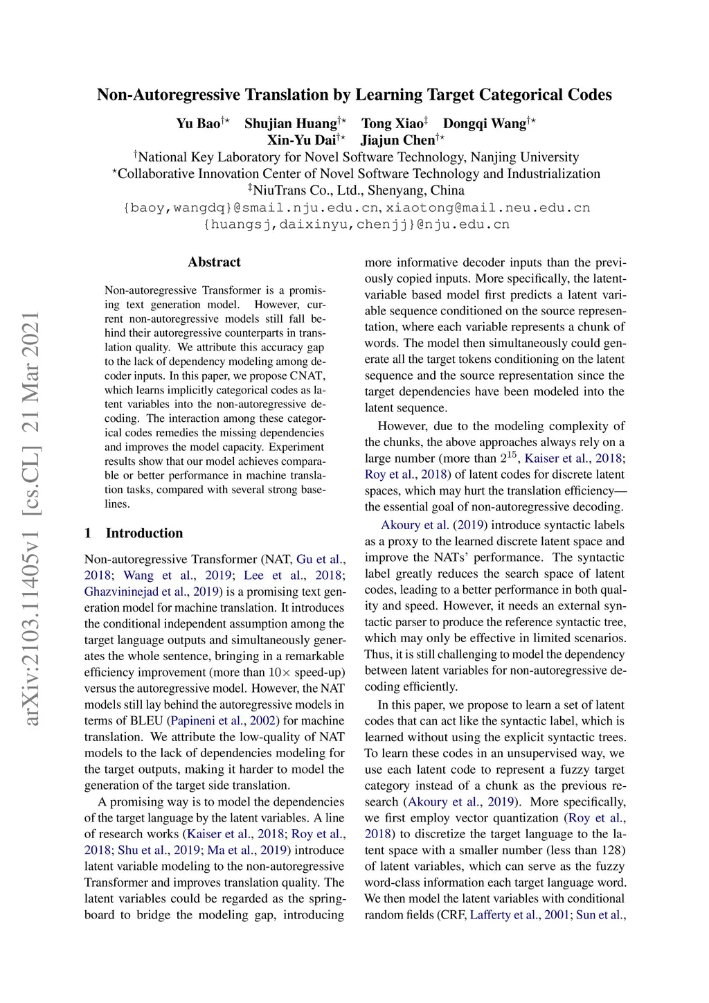 Non-autoregressive Transformer is a promising text generation model. However, current non-autoregressive models still fall behind their autoregressive counterparts in translation quality. We attribute this accuracy gap to the lack of dependency modeling among decoder inputs. In this paper, we propose CNAT, which learns implicitly categorical codes as latent variables into the non-autoregressive decoding. The interaction among these categorical codes remedies the missing dependencies and improves the model capacity. Experiment results show that our model achieves comparable or better performance in machine translation tasks, compared with several strong baselines.
