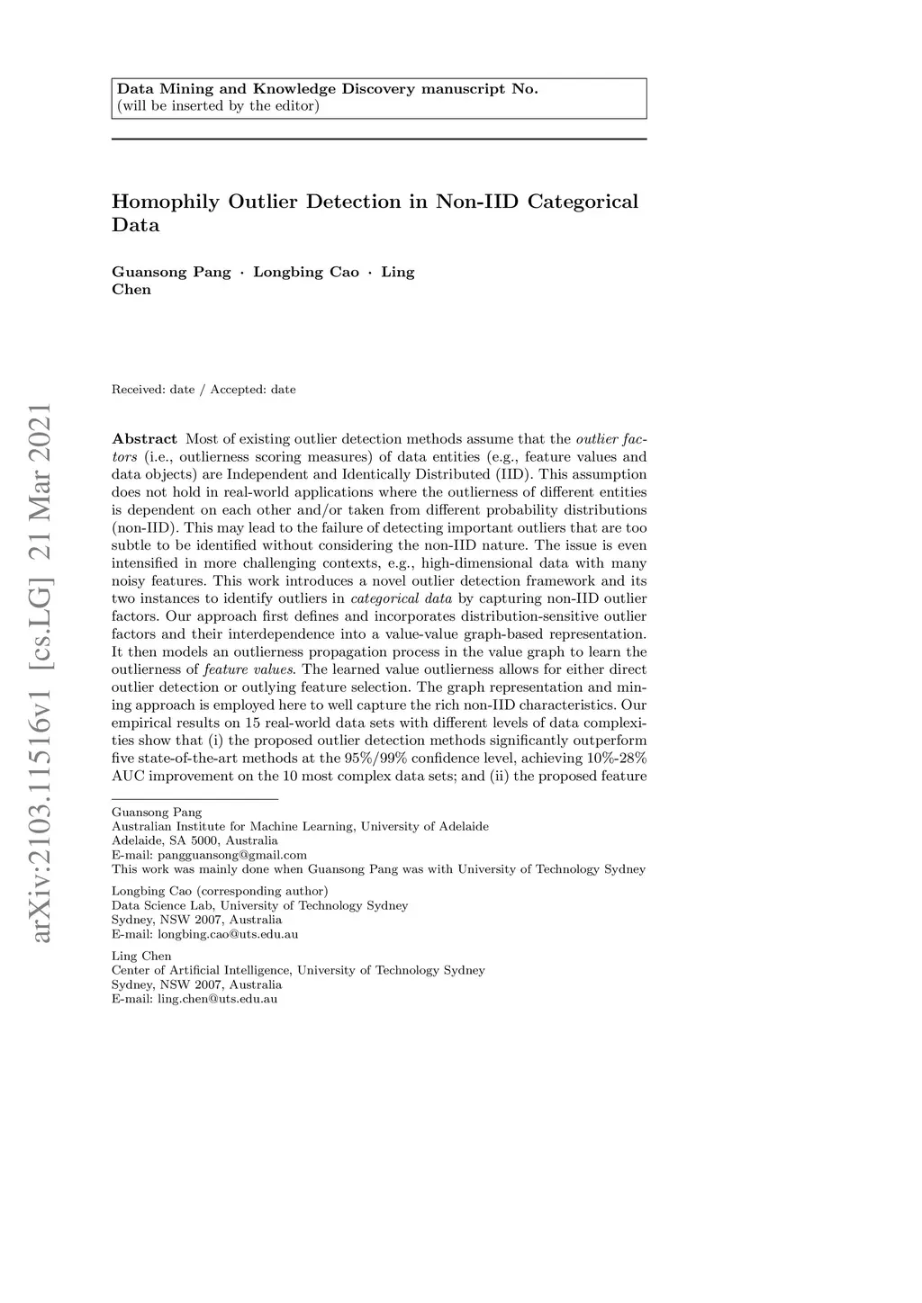 Most of existing outlier detection methods assume that the outlier factors (i.e., outlierness scoring measures) of data entities (e.g., feature values and data objects) are Independent and Identically Distributed (IID). This assumption does not hold in real-world applications where the outlierness of different entities is dependent on each other and/or taken from different probability distributions (non-IID). This may lead to the failure of detecting important outliers that are too subtle to be identified without considering the non-IID nature. The issue is even intensified in more challenging contexts, e.g., high-dimensional data with many noisy features. This work introduces a novel outlier detection framework and its two instances to identify outliers in categorical data by capturing non-IID outlier factors. Our approach first defines and incorporates distribution-sensitive outlier factors and their interdependence into a value-value graph-based representation. It then models an outlierness propagation process in the value graph to learn the outlierness of feature values. The learned value outlierness allows for either direct outlier detection or outlying feature selection. The graph representation and mining approach is employed here to well capture the rich non-IID characteristics. Our empirical results on 15 real-world data sets with different levels of data complexities show that (i) the proposed outlier detection methods significantly outperform five state-of-the-art methods at the 95%/99% confidence level, achieving 10%-28% AUC improvement on the 10 most complex data sets; and (ii) the proposed feature selection methods significantly outperform three competing methods in enabling subsequent outlier detection of two different existing detectors.