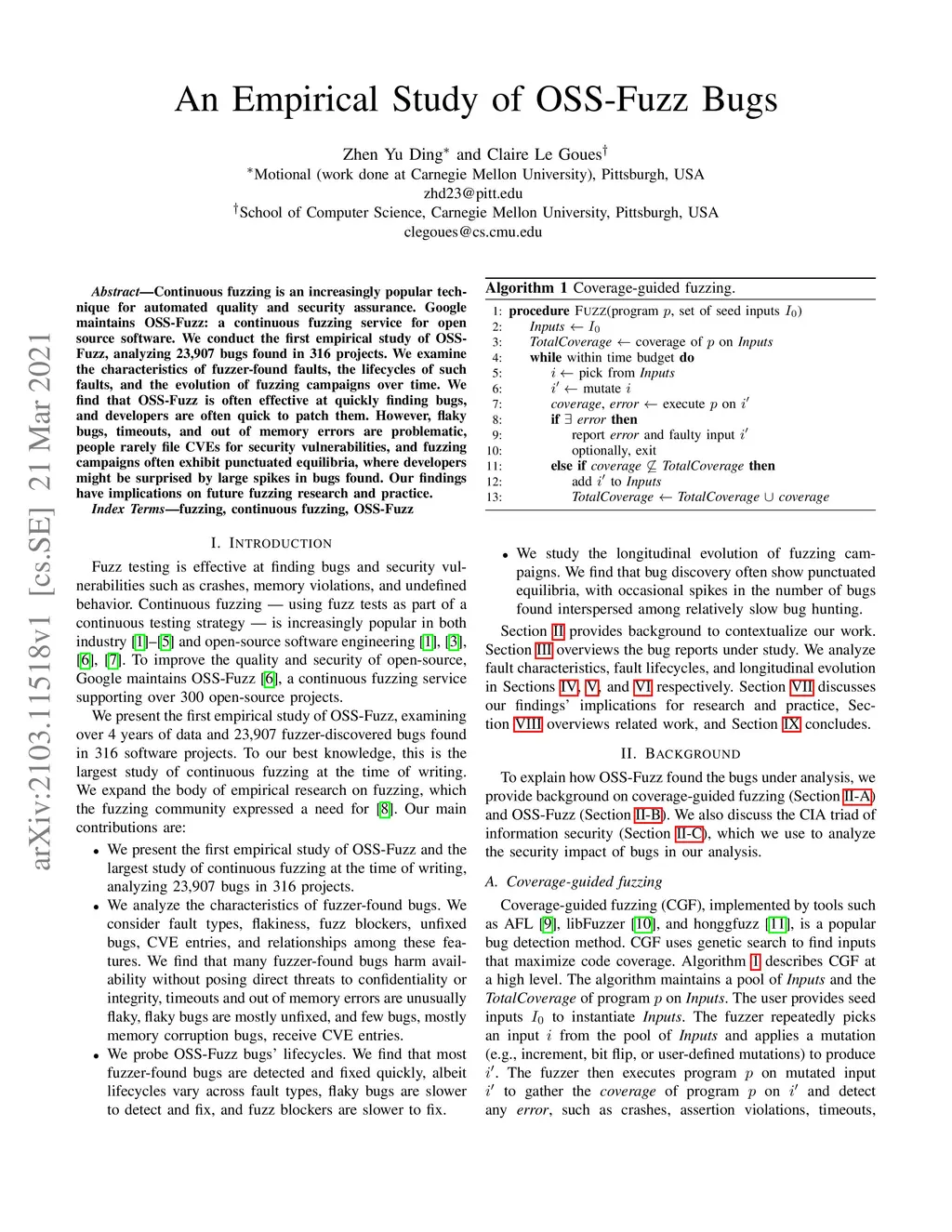 Continuous fuzzing is an increasingly popular technique for automated quality and security assurance. Google maintains OSS-Fuzz: a continuous fuzzing service for open source software. We conduct the first empirical study of OSS-Fuzz, analyzing 23,907 bugs found in 316 projects. We examine the characteristics of fuzzer-found faults, the lifecycles of such faults, and the evolution of fuzzing campaigns over time. We find that OSS-Fuzz is often effective at quickly finding bugs, and developers are often quick to patch them. However, flaky bugs, timeouts, and out of memory errors are problematic, people rarely file CVEs for security vulnerabilities, and fuzzing campaigns often exhibit punctuated equilibria, where developers might be surprised by large spikes in bugs found. Our findings have implications on future fuzzing research and practice.