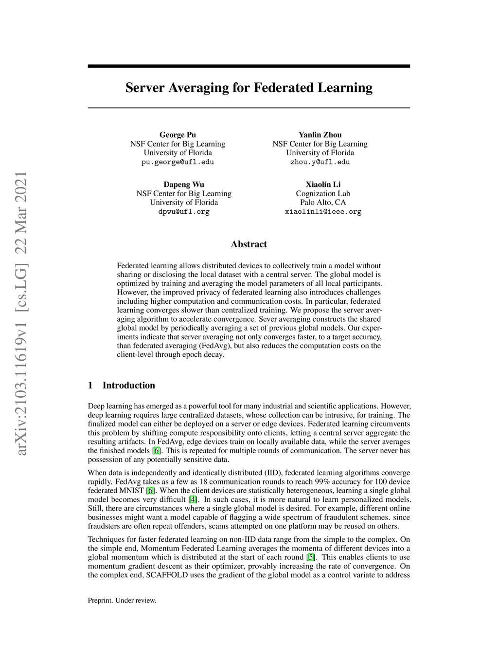 Federated learning allows distributed devices to collectively train a model without sharing or disclosing the local dataset with a central server. The global model is optimized by training and averaging the model parameters of all local participants. However, the improved privacy of federated learning also introduces challenges including higher computation and communication costs. In particular, federated learning converges slower than centralized training. We propose the server averaging algorithm to accelerate convergence. Sever averaging constructs the shared global model by periodically averaging a set of previous global models. Our experiments indicate that server averaging not only converges faster, to a target accuracy, than federated averaging (FedAvg), but also reduces the computation costs on the client-level through epoch decay.