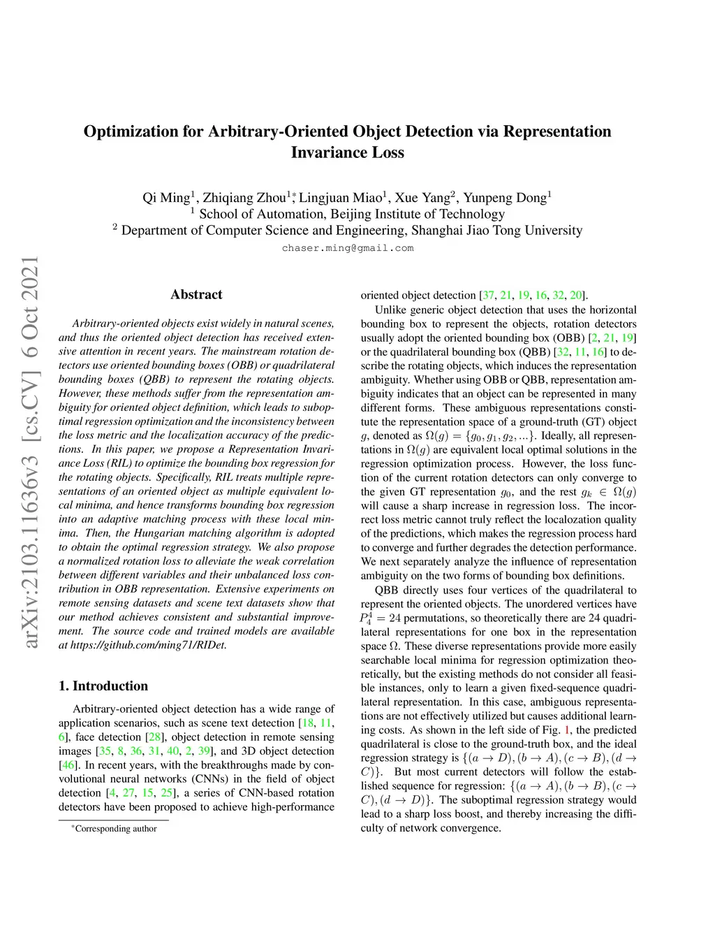 Arbitrary-oriented objects exist widely in natural scenes, and thus the oriented object detection has received extensive attention in recent years. The mainstream rotation detectors use oriented bounding boxes (OBB) or quadrilateral bounding boxes (QBB) to represent the rotating objects. However, these methods suffer from the representation ambiguity for oriented object definition, which leads to suboptimal regression optimization and the inconsistency between the loss metric and the localization accuracy of the predictions. In this paper, we propose a Representation Invariance Loss (RIL) to optimize the bounding box regression for the rotating objects. Specifically, RIL treats multiple representations of an oriented object as multiple equivalent local minima, and hence transforms bounding box regression into an adaptive matching process with these local minima. Then, the Hungarian matching algorithm is adopted to obtain the optimal regression strategy. We also propose a normalized rotation loss to alleviate the weak correlation between different variables and their unbalanced loss contribution in OBB representation. Extensive experiments on remote sensing datasets and scene text datasets show that our method achieves consistent and substantial improvement. The source code and trained models are available at https://github.com/ming71/RIDet.