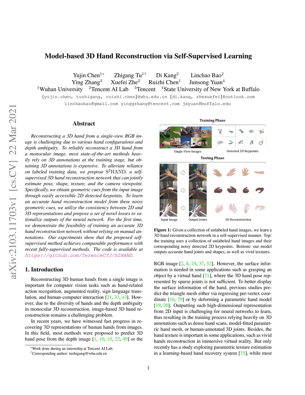 Reconstructing a 3D hand from a single-view RGB image is challenging due to various hand configurations and depth ambiguity. To reliably reconstruct a 3D hand from a monocular image, most state-of-the-art methods heavily rely on 3D annotations at the training stage, but obtaining 3D annotations is expensive. To alleviate reliance on labeled training data, we propose S2HAND, a self-supervised 3D hand reconstruction network that can jointly estimate pose, shape, texture, and the camera viewpoint. Specifically, we obtain geometric cues from the input image through easily accessible 2D detected keypoints. To learn an accurate hand reconstruction model from these noisy geometric cues, we utilize the consistency between 2D and 3D representations and propose a set of novel losses to rationalize outputs of the neural network. For the first time, we demonstrate the feasibility of training an accurate 3D hand reconstruction network without relying on manual annotations. Our experiments show that the proposed method achieves comparable performance with recent fully-supervised methods while using fewer supervision data.