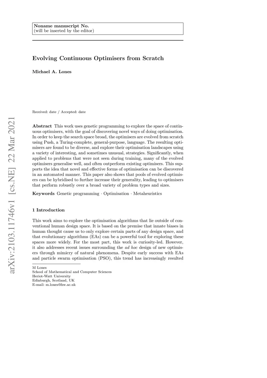 This work uses genetic programming to explore the space of continuous optimisers, with the goal of discovering novel ways of doing optimisation. In order to keep the search space broad, the optimisers are evolved from scratch using Push, a Turing-complete, general-purpose, language. The resulting optimisers are found to be diverse, and explore their optimisation landscapes using a variety of interesting, and sometimes unusual, strategies. Significantly, when applied to problems that were not seen during training, many of the evolved optimisers generalise well, and often outperform existing optimisers. This supports the idea that novel and effective forms of optimisation can be discovered in an automated manner. This paper also shows that pools of evolved optimisers can be hybridised to further increase their generality, leading to optimisers that perform robustly over a broad variety of problem types and sizes.