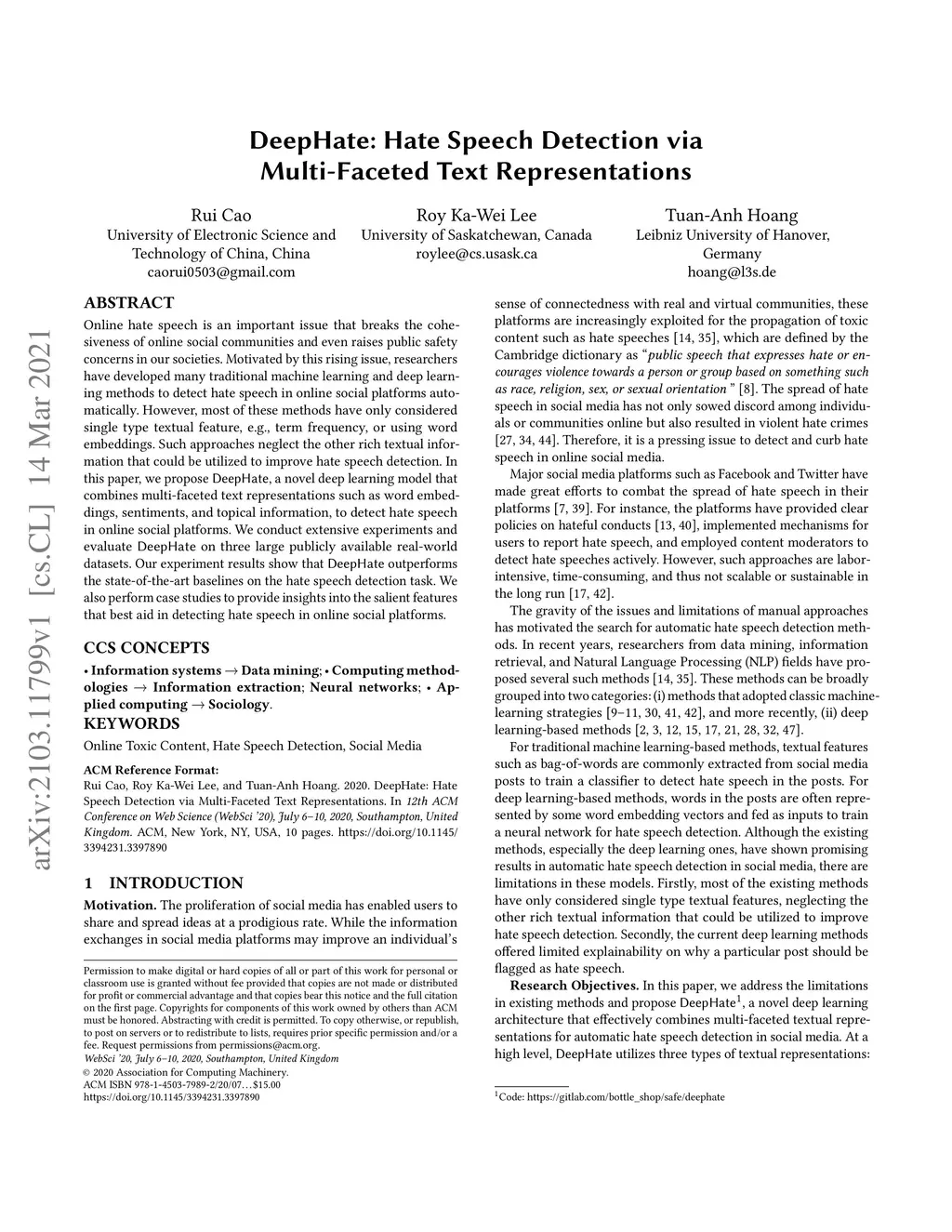 DeepHate: Hate Speech Detection via Multi-Faceted Text Representations