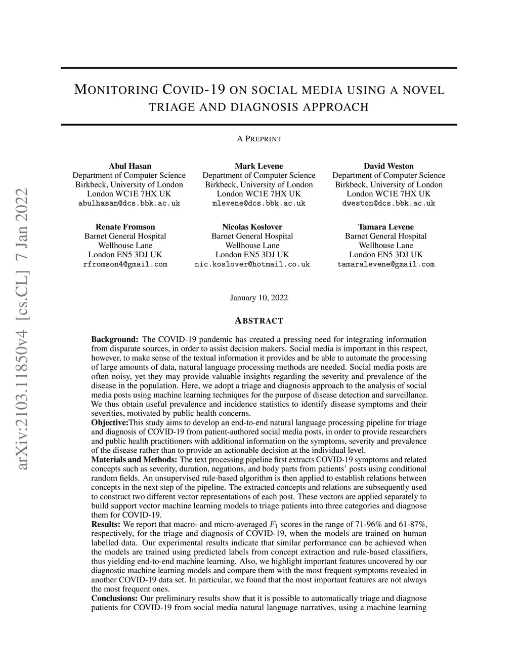Triage and diagnosis of COVID-19 from medical social media