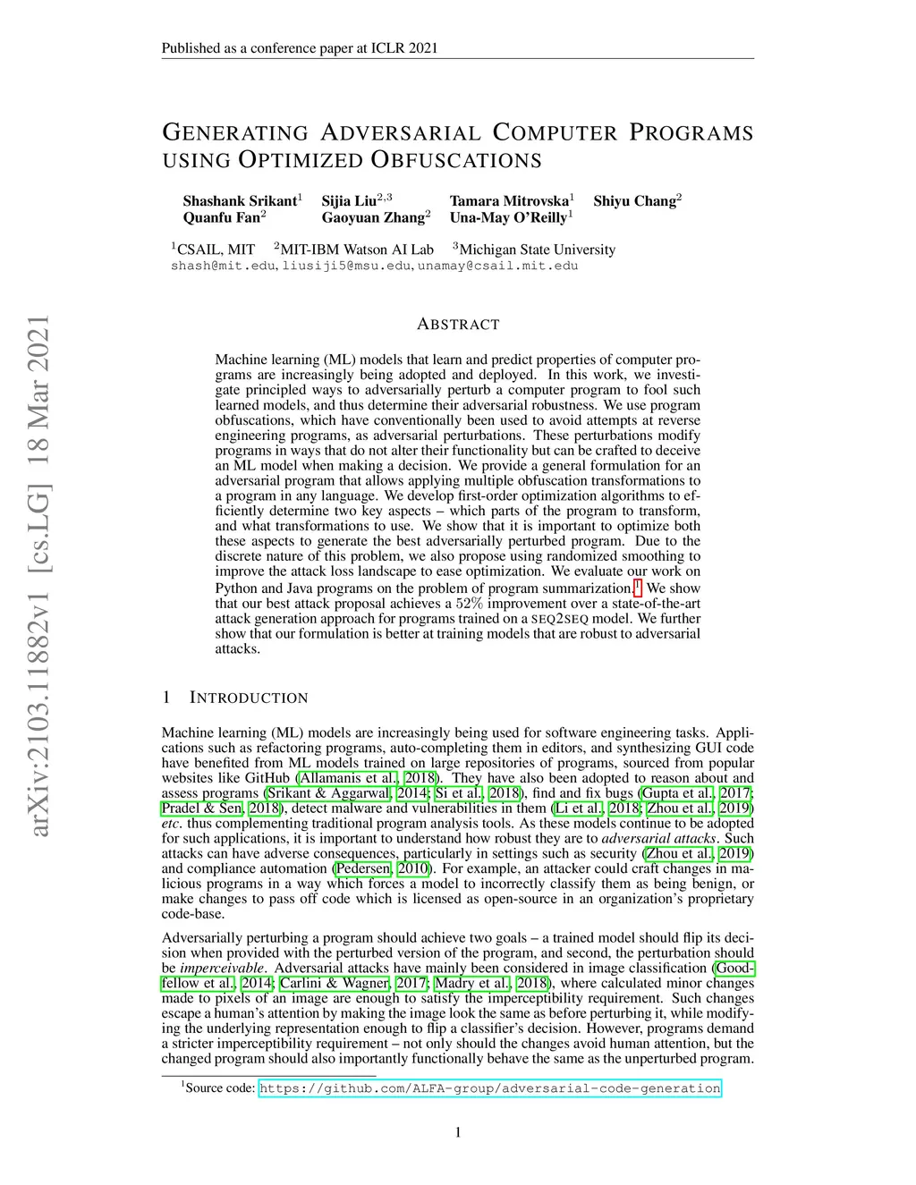 Generating Adversarial Computer Programs using Optimized Obfuscations