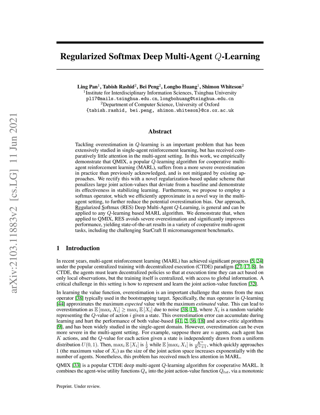 Overestimation in -learning is an important problem that has been extensively studied in single-agent reinforcement learning, but has received comparatively little attention in the multi-agent setting. In this work, we empirically demonstrate that QMIX, a popular -learning algorithm for cooperative multi-agent reinforcement learning (MARL), suffers from a particularly severe overestimation problem which is not mitigated by existing approaches. We rectify this by designing a novel regularization-based update scheme that penalizes large joint action-values deviating from a baseline and demonstrate its effectiveness in stabilizing learning. We additionally propose to employ a softmax operator, which we efficiently approximate in the multi-agent setting, to further reduce the potential overestimation bias. We demonstrate that our Softmax with Regularization (SR) method, when applied to QMIX, accomplishes its goal of avoiding severe overestimation and significantly improves performance in a variety of cooperative multi-agent tasks. To demonstrate the versatility of our method, we apply it to other -learning based MARL algorithms and achieve similar performance gains. Finally, we show that our method provides a consistent performance improvement on a set of challenging StarCraft II micromanagement tasks.