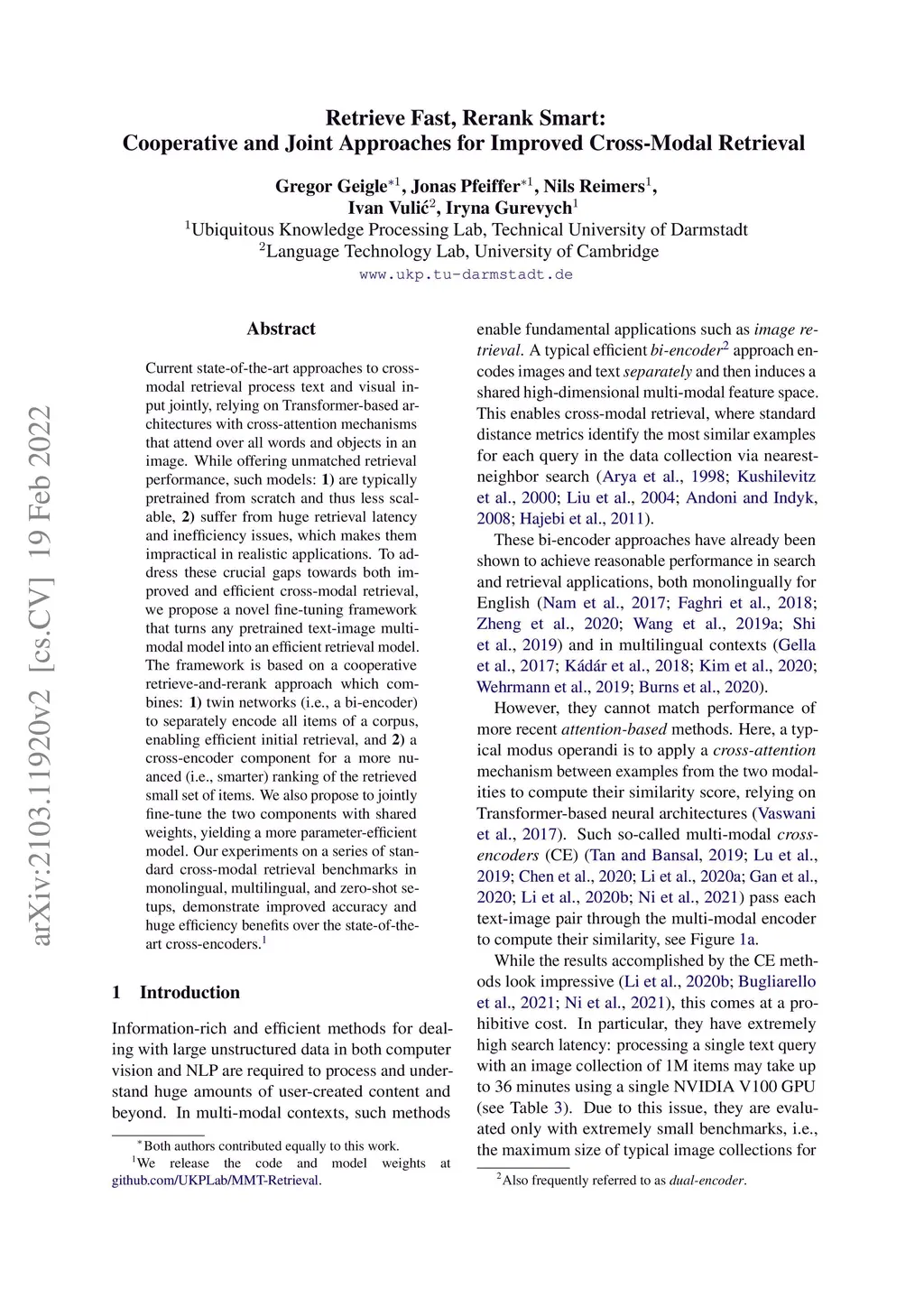 Current state-of-the-art approaches to cross-modal retrieval process text and visual input jointly, relying on Transformer-based architectures with cross-attention mechanisms that attend over all words and objects in an image. While offering unmatched retrieval performance, such models: 1) are typically pretrained from scratch and thus less scalable, 2) suffer from huge retrieval latency and inefficiency issues, which makes them impractical in realistic applications. To address these crucial gaps towards both improved and efficient cross-modal retrieval, we propose a novel fine-tuning framework that turns any pretrained text-image multi-modal model into an efficient retrieval model. The framework is based on a cooperative retrieve-and-rerank approach which combines: 1) twin networks (i.e., a bi-encoder) to separately encode all items of a corpus, enabling efficient initial retrieval, and 2) a cross-encoder component for a more nuanced (i.e., smarter) ranking of the retrieved small set of items. We also propose to jointly fine-tune the two components with shared weights, yielding a more parameter-efficient model. Our experiments on a series of standard cross-modal retrieval benchmarks in monolingual, multilingual, and zero-shot setups, demonstrate improved accuracy and huge efficiency benefits over the state-of-the-art cross-encoders.