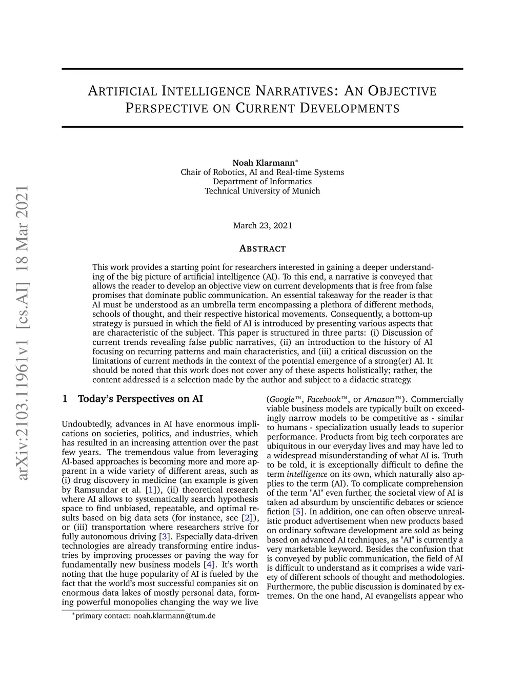 This work provides a starting point for researchers interested in gaining a deeper understanding of the big picture of artificial intelligence (AI). To this end, a narrative is conveyed that allows the reader to develop an objective view on current developments that is free from false promises that dominate public communication. An essential takeaway for the reader is that AI must be understood as an umbrella term encompassing a plethora of different methods, schools of thought, and their respective historical movements. Consequently, a bottom-up strategy is pursued in which the field of AI is introduced by presenting various aspects that are characteristic of the subject. This paper is structured in three parts: (i) Discussion of current trends revealing false public narratives, (ii) an introduction to the history of AI focusing on recurring patterns and main characteristics, and (iii) a critical discussion on the limitations of current methods in the context of the potential emergence of a strong(er) AI. It should be noted that this work does not cover any of these aspects holistically; rather, the content addressed is a selection made by the author and subject to a didactic strategy.