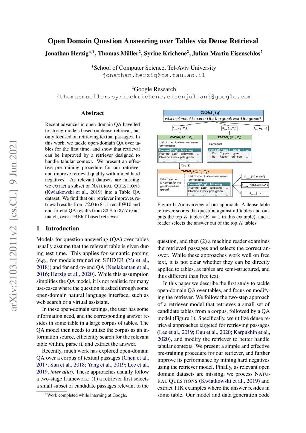 Recent advances in open-domain QA have led to strong models based on dense retrieval, but only focused on retrieving textual passages. In this work, we tackle open-domain QA over tables for the first time, and show that retrieval can be improved by a retriever designed to handle tabular context. We present an effective pre-training procedure for our retriever and improve retrieval quality with mined hard negatives. As relevant datasets are missing, we extract a subset of Natural Questions (Kwiatkowski et al., 2019) into a Table QA dataset. We find that our retriever improves retrieval results from 72.0 to 81.1 recall@10 and end-to-end QA results from 33.8 to 37.7 exact match, over a BERT based retriever.