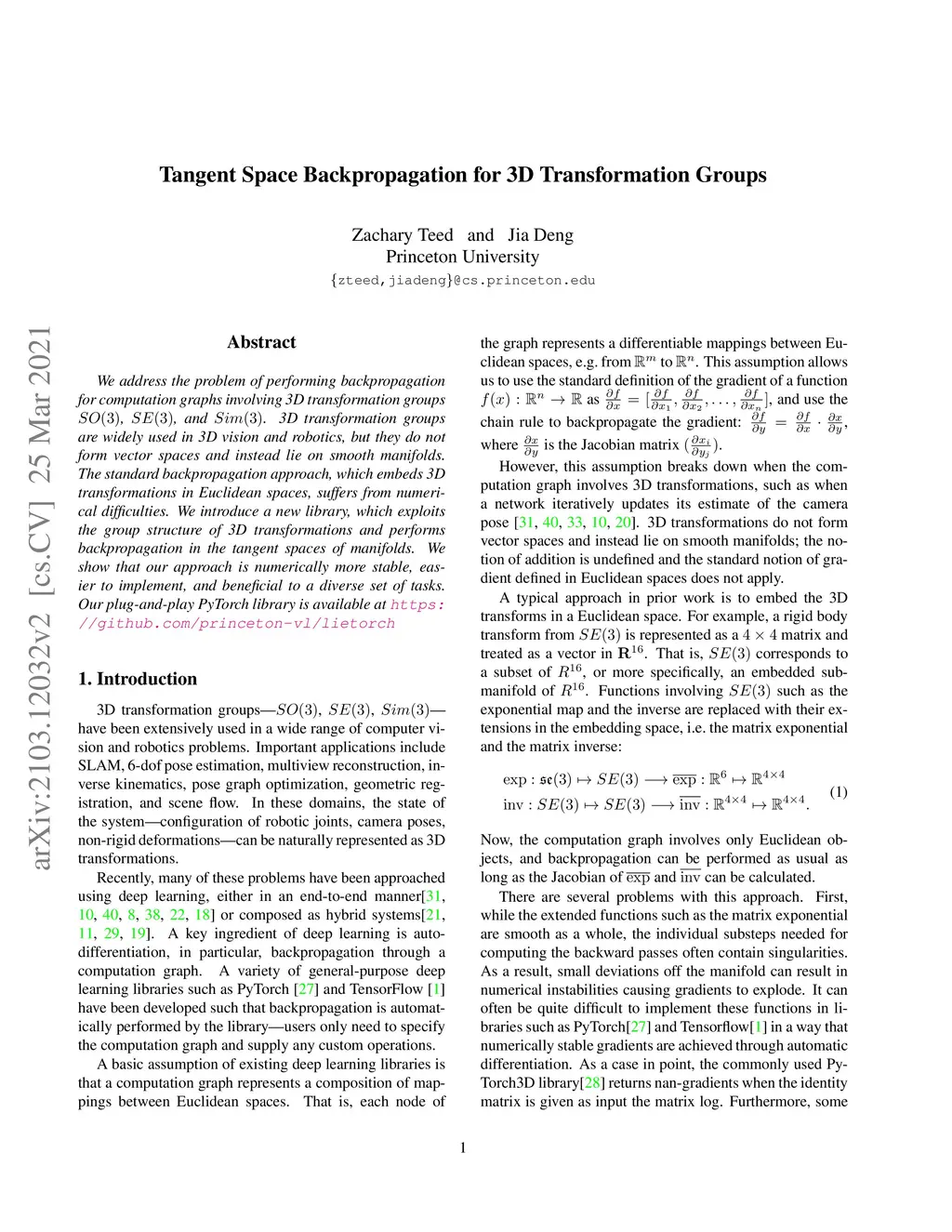 We address the problem of performing backpropagation for computation graphs involving 3D transformation groups SO(3), SE(3), and Sim(3). 3D transformation groups are widely used in 3D vision and robotics, but they do not form vector spaces and instead lie on smooth manifolds. The standard backpropagation approach, which embeds 3D transformations in Euclidean spaces, suffers from numerical difficulties. We introduce a new library, which exploits the group structure of 3D transformations and performs backpropagation in the tangent spaces of manifolds. We show that our approach is numerically more stable, easier to implement, and beneficial to a diverse set of tasks. Our plug-and-play PyTorch library is available at https://github.com/princeton-vl/lietorch.