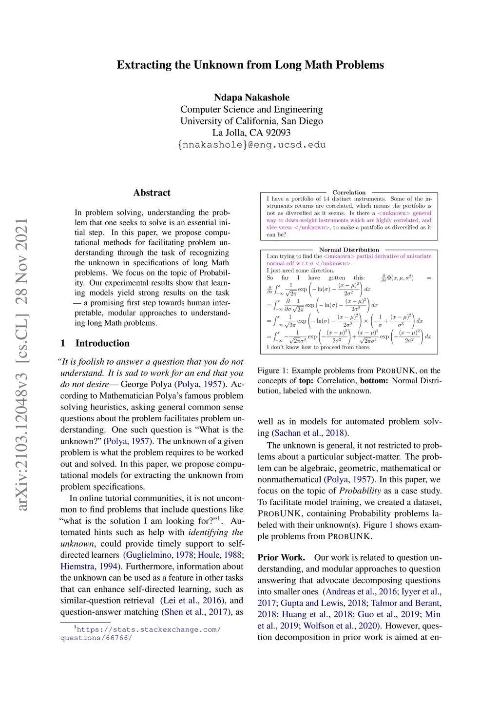In problem solving, understanding the problem that one seeks to solve is an essential initial step. In this paper, we propose computational methods for facilitating problem understanding through the task of recognizing the unknown in specifications of long Math problems. We focus on the topic of Probability. Our experimental results show that learning models yield strong results on the task, a promising first step towards human interpretable, modular approaches to understanding long Math problems.