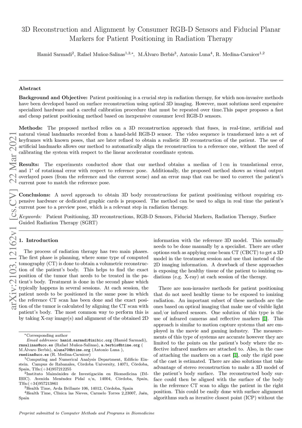 BACKGROUND AND OBJECTIVE: Patient positioning is a crucial step in radiation therapy, for which non-invasive methods have been developed based on surface reconstruction using optical 3D imaging. However, most solutions need expensive specialized hardware and a careful calibration procedure that must be repeated over time.This paper proposes a fast and cheap patient positioning method based on inexpensive consumer level RGB-D sensors. METHODS: The proposed method relies on a 3D reconstruction approach that fuses, in real-time, artificial and natural visual landmarks recorded from a hand-held RGB-D sensor. The video sequence is transformed into a set of keyframes with known poses, that are later refined to obtain a realistic 3D reconstruction of the patient. The use of artificial landmarks allows our method to automatically align the reconstruction to a reference one, without the need of calibrating the system with respect to the linear accelerator coordinate system. RESULTS:The experiments conducted show that our method obtains a median of 1 cm in translational error, and 1 degree of rotational error with respect to reference pose. Additionally, the proposed method shows as visual output overlayed poses (from the reference and the current scene) and an error map that can be used to correct the patient's current pose to match the reference pose. CONCLUSIONS: A novel approach to obtain 3D body reconstructions for patient positioning without requiring expensive hardware or dedicated graphic cards is proposed. The method can be used to align in real time the patient's current pose to a preview pose, which is a relevant step in radiation therapy.