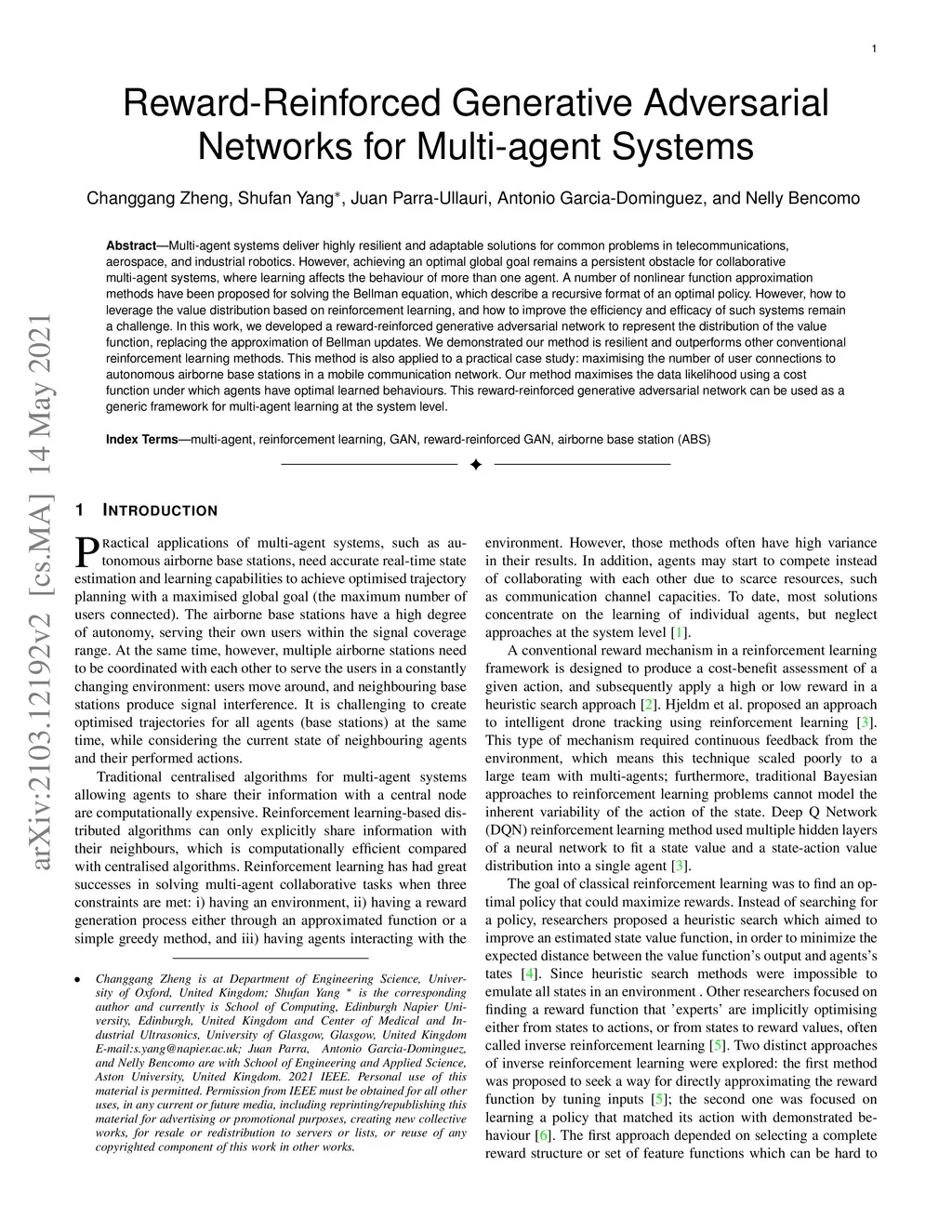 Reinforcement learning algorithms in multi-agent systems deliver highly resilient and adaptable solutions for common problems in telecommunications,aerospace, and industrial robotics. However, achieving an optimal global goal remains a persistent obstacle for collaborative multi-agent systems, where learning affects the behaviour of more than one agent. A number of nonlinear function approximation methods have been proposed for solving the Bellman equation, which describe a recursive format of an optimal policy. However, how to leverage the value distribution based on reinforcement learning, and how to improve the efficiency and efficacy of such systems remain a challenge. In this work, we developed a reward-reinforced generative adversarial network to represent the distribution of the value function, replacing the approximation of Bellman updates. We demonstrated our method is resilient and outperforms other conventional reinforcement learning methods. This method is also applied to a practical case study: maximising the number of user connections to autonomous airborne base stations in a mobile communication network. Our method maximises the data likelihood using a cost function under which agents have optimal learned behaviours. This reward-reinforced generative adversarial network can be used as ageneric framework for multi-agent learning at the system level
