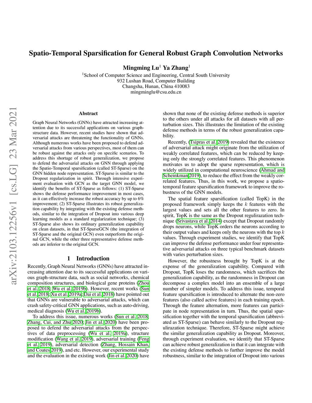 Graph Neural Networks (GNNs) have attracted increasing attention due to its successful applications on various graph-structure data. However, recent studies have shown that adversarial attacks are threatening the functionality of GNNs. Although numerous works have been proposed to defend adversarial attacks from various perspectives, most of them can be robust against the attacks only on specific scenarios. To address this shortage of robust generalization, we propose to defend the adversarial attacks on GNN through applying the Spatio-Temporal sparsification (called ST-Sparse) on the GNN hidden node representation. ST-Sparse is similar to the Dropout regularization in spirit. Through intensive experiment evaluation with GCN as the target GNN model, we identify the benefits of ST-Sparse as follows: (1) ST-Sparse shows the defense performance improvement in most cases, as it can effectively increase the robust accuracy by up to 6\% improvement; (2) ST-Sparse illustrates its robust generalization capability by integrating with the existing defense methods, similar to the integration of Dropout into various deep learning models as a standard regularization technique; (3) ST-Sparse also shows its ordinary generalization capability on clean datasets, in that ST-SparseGCN (the integration of ST-Sparse and the original GCN) even outperform the original GCN, while the other three representative defense methods are inferior to the original GCN.