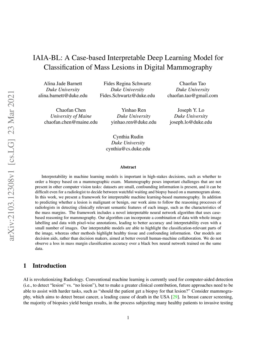 Interpretability in machine learning models is important in high-stakes decisions, such as whether to order a biopsy based on a mammographic exam. Mammography poses important challenges that are not present in other computer vision tasks: datasets are small, confounding information is present, and it can be difficult even for a radiologist to decide between watchful waiting and biopsy based on a mammogram alone. In this work, we present a framework for interpretable machine learning-based mammography. In addition to predicting whether a lesion is malignant or benign, our work aims to follow the reasoning processes of radiologists in detecting clinically relevant semantic features of each image, such as the characteristics of the mass margins. The framework includes a novel interpretable neural network algorithm that uses case-based reasoning for mammography. Our algorithm can incorporate a combination of data with whole image labelling and data with pixel-wise annotations, leading to better accuracy and interpretability even with a small number of images. Our interpretable models are able to highlight the classification-relevant parts of the image, whereas other methods highlight healthy tissue and confounding information. Our models are decision aids, rather than decision makers, aimed at better overall human-machine collaboration. We do not observe a loss in mass margin classification accuracy over a black box neural network trained on the same data.
