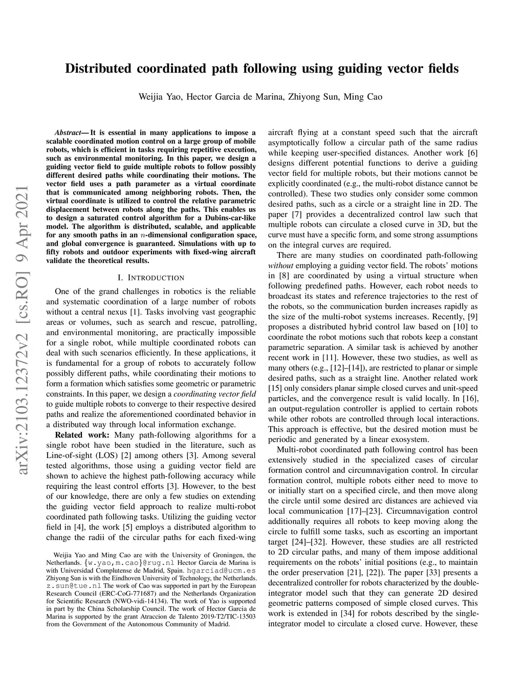 Distributed coordinated path following using guiding vector fields