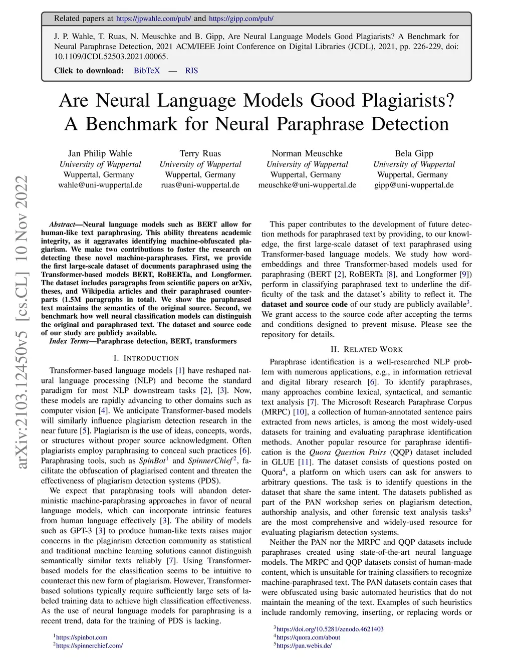 The rise of language models such as BERT allows for high-quality text paraphrasing. This is a problem to academic integrity, as it is difficult to differentiate between original and machine-generated content. We propose a benchmark consisting of paraphrased articles using recent language models relying on the Transformer architecture. Our contribution fosters future research of paraphrase detection systems as it offers a large collection of aligned original and paraphrased documents, a study regarding its structure, classification experiments with state-of-the-art systems, and we make our findings publicly available.